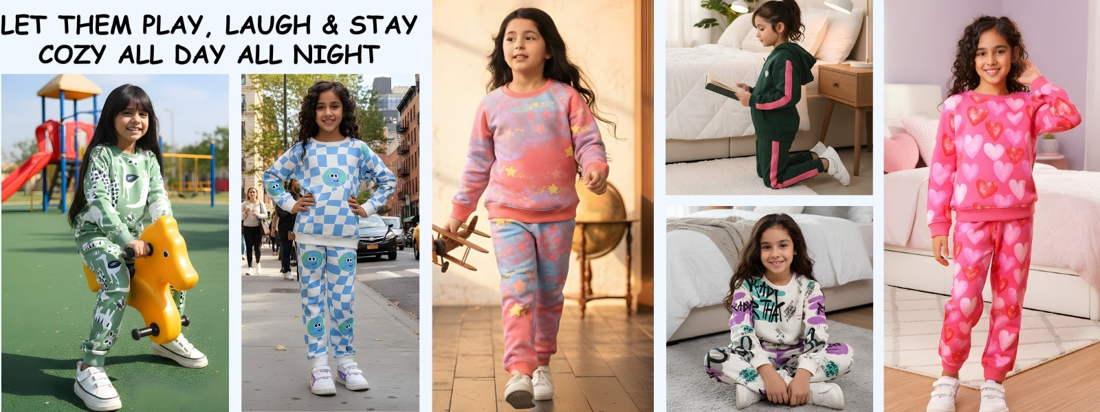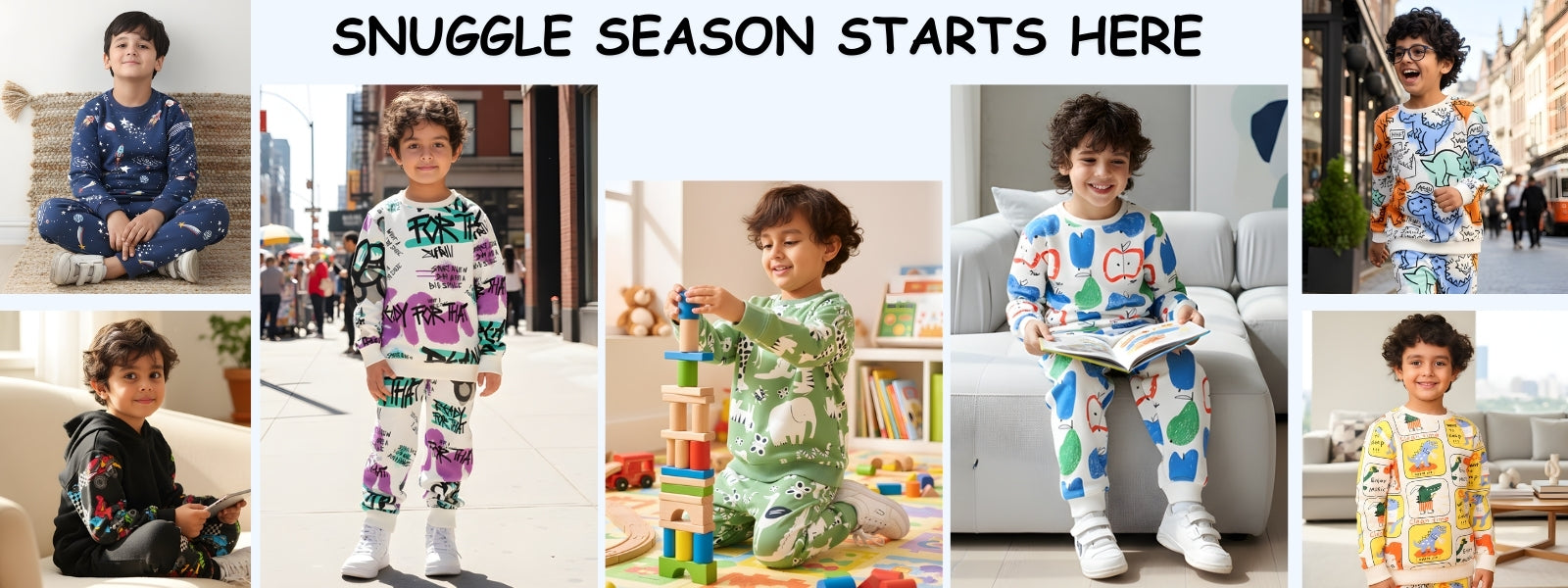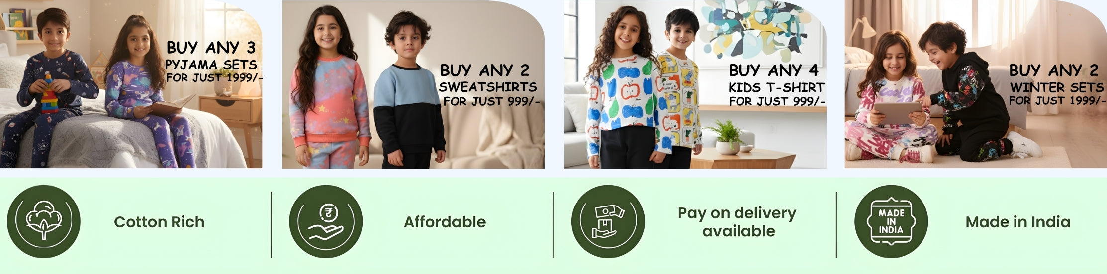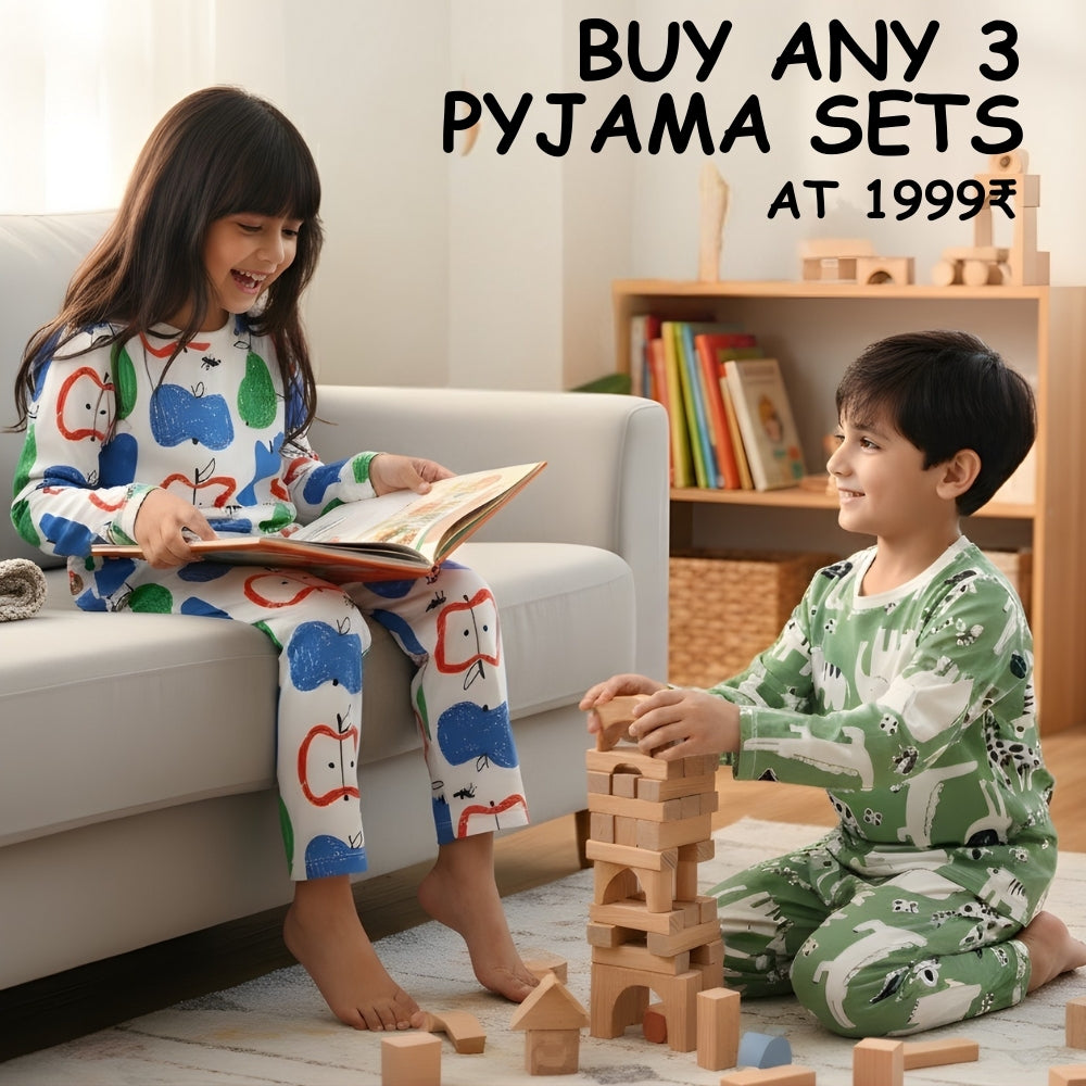 Made from 100% cotton and skin-friendly fabrics, our night suits and pyjama sets keep your child cool and comfortable all night. Perfect for India’s warm climate, our sleepwear comes in fun prints, easy fits, and soft textures kids love.