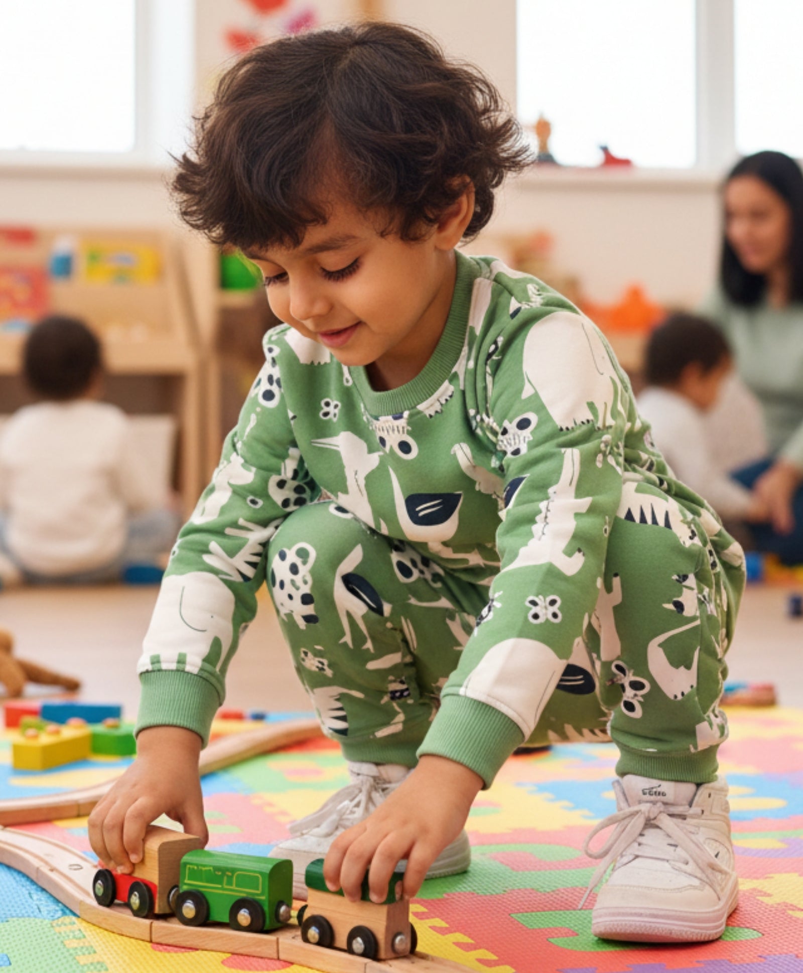 This Animal Green Fleece Boys Sweatshirt Jogger Set is a perfect blend of comfort and style for kids. Made from soft fleece fabric, it keeps them warm and cozy all day. The playful animal design on the sweatshirt adds charm, while the matching joggers ensure ease of movement. Ideal for playtime, outings, or lounging at home.