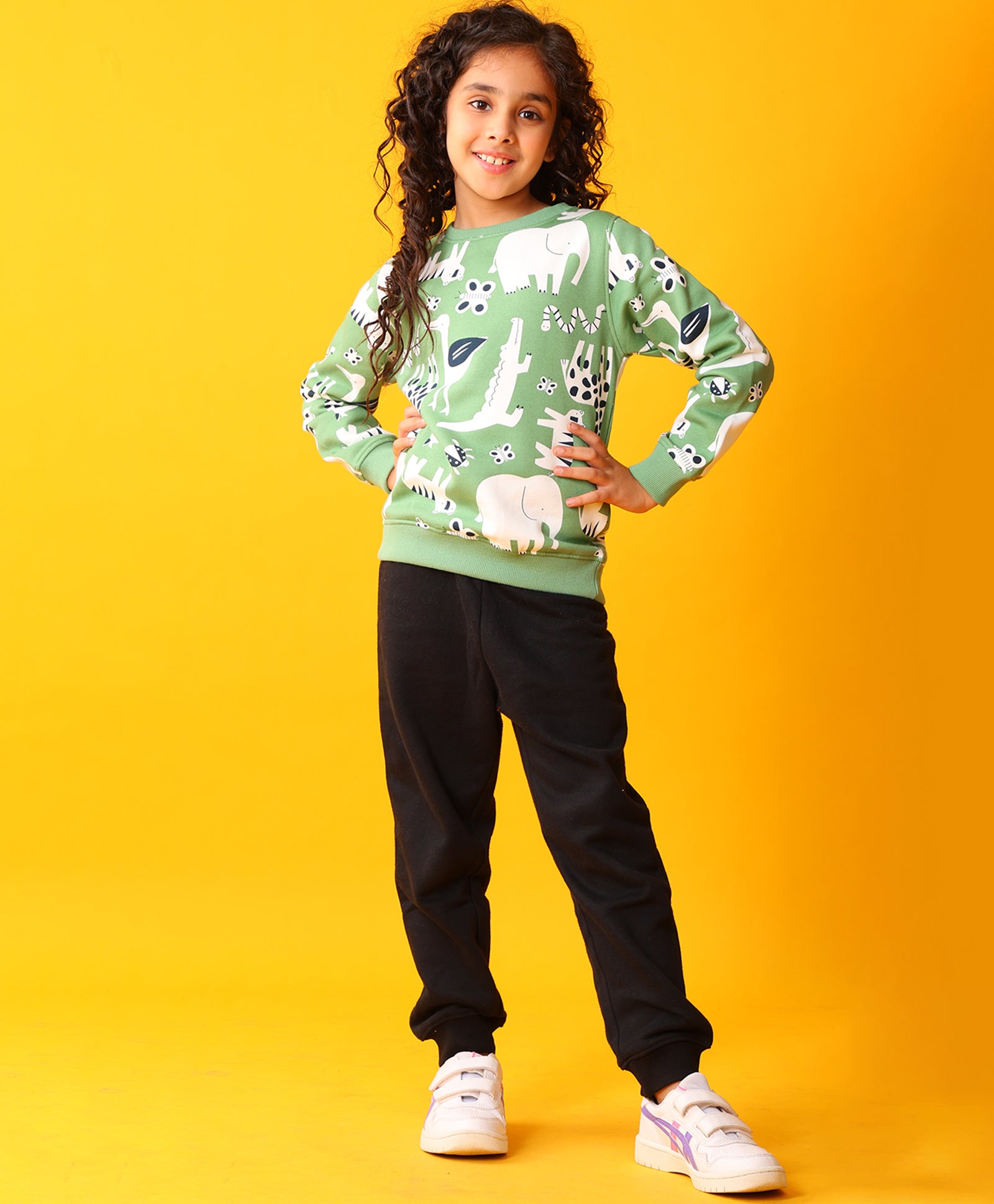 Ascend to wild comfort with the ANIMAL GREEN FLEECE GIRLS SWEATSHIRT JOGGER SET - GREEN/BLACK. The cozy SWEATSHIRT boasts an energetic, vibrant ALL OVER PRINTED jungle animal design. Paired with sleek black joggers, this FLEECE set ensures maximum warmth and adventurous style for all her daily explorations.