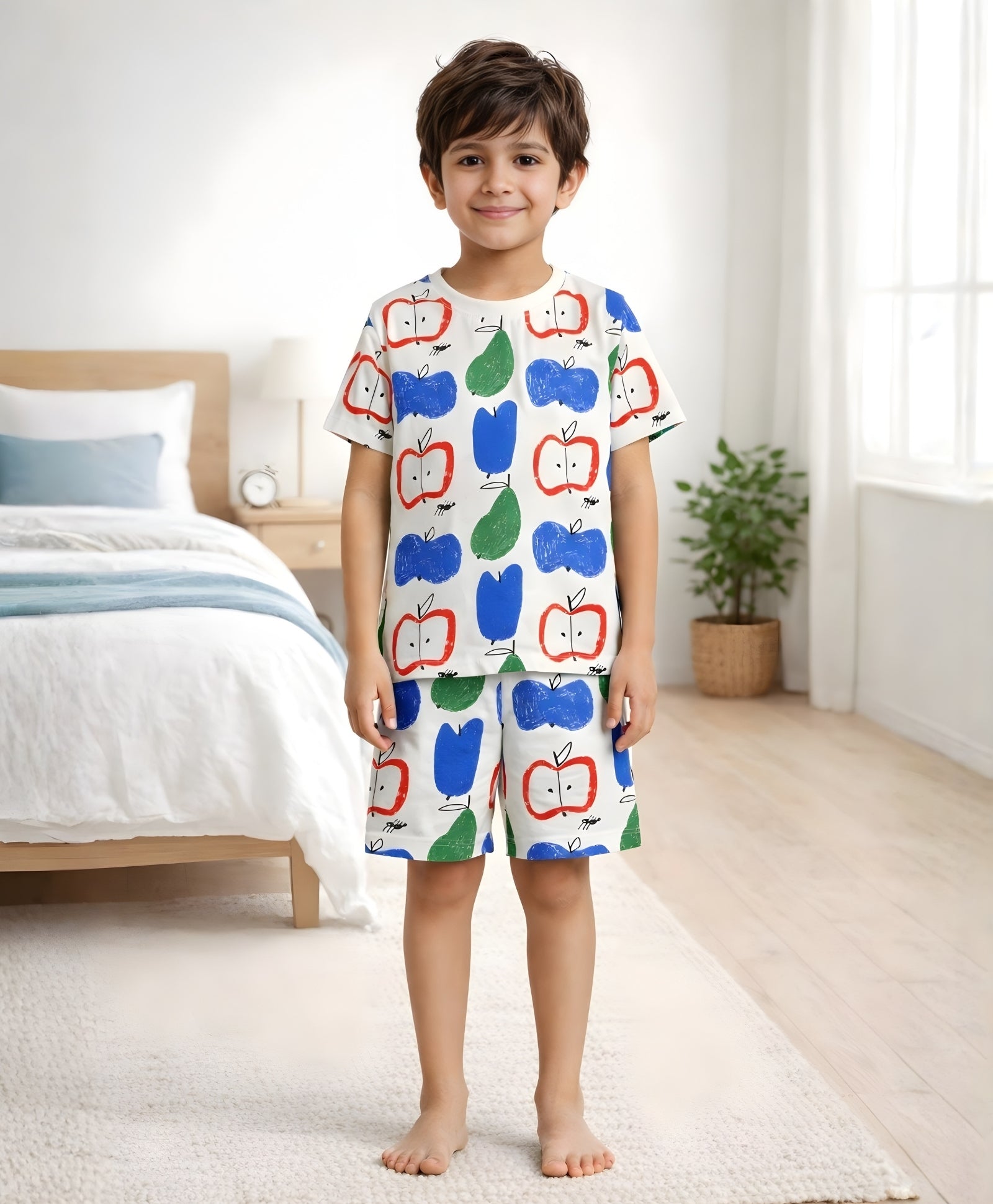 Keep your little one cool and cozy in this Apple Pear Sleepwear Short Set. Featuring a crisp white base with a vibrant fruit print, this soft cotton set is perfect for warm nights. The breathable tee and elastic-waist shorts offer a snug, flexible fit for sweet dreams and playful mornings.