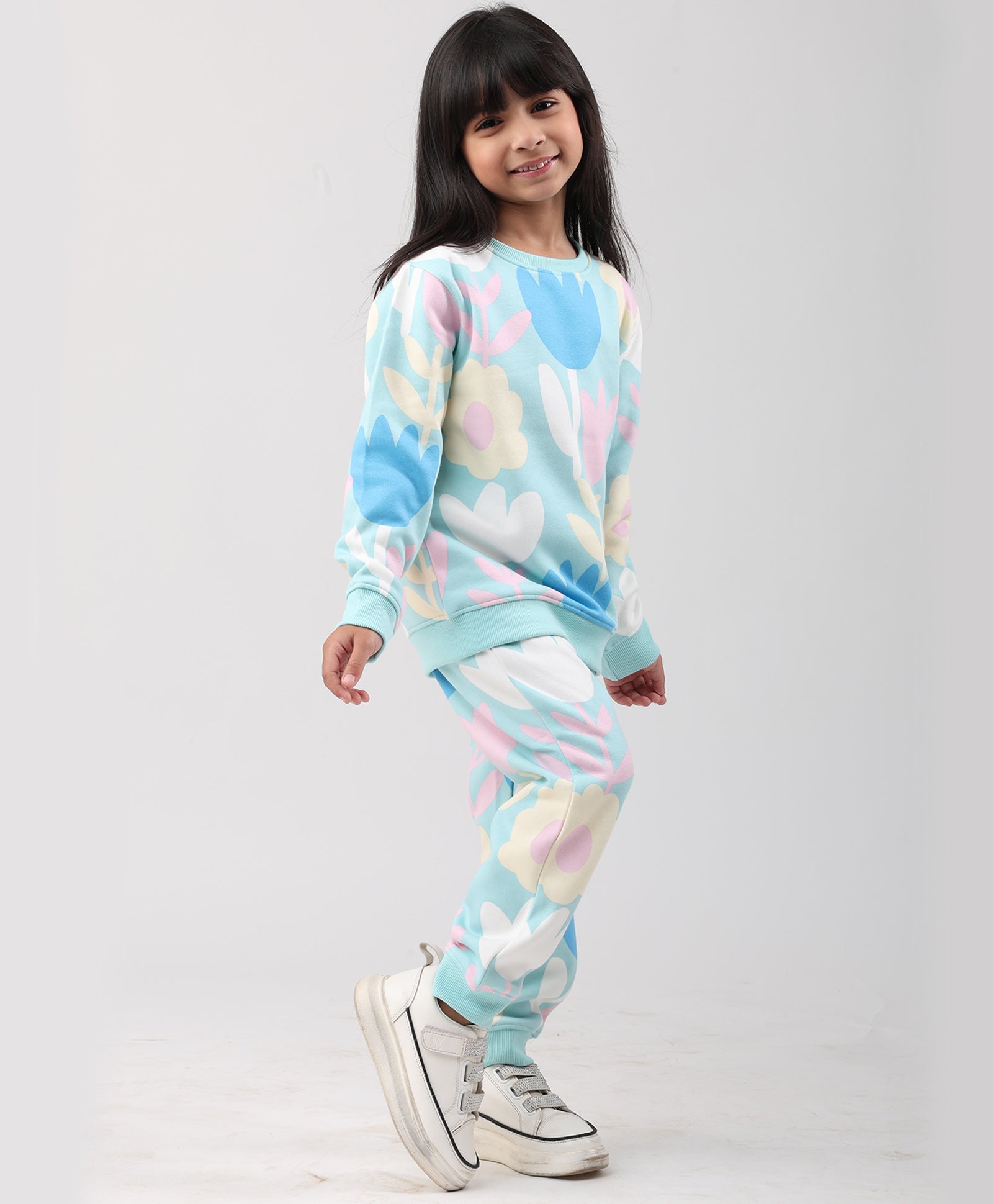 AQUA FLOWER FLEECE GIRLS SWEATSHIRT JOGGER SET - AQUA