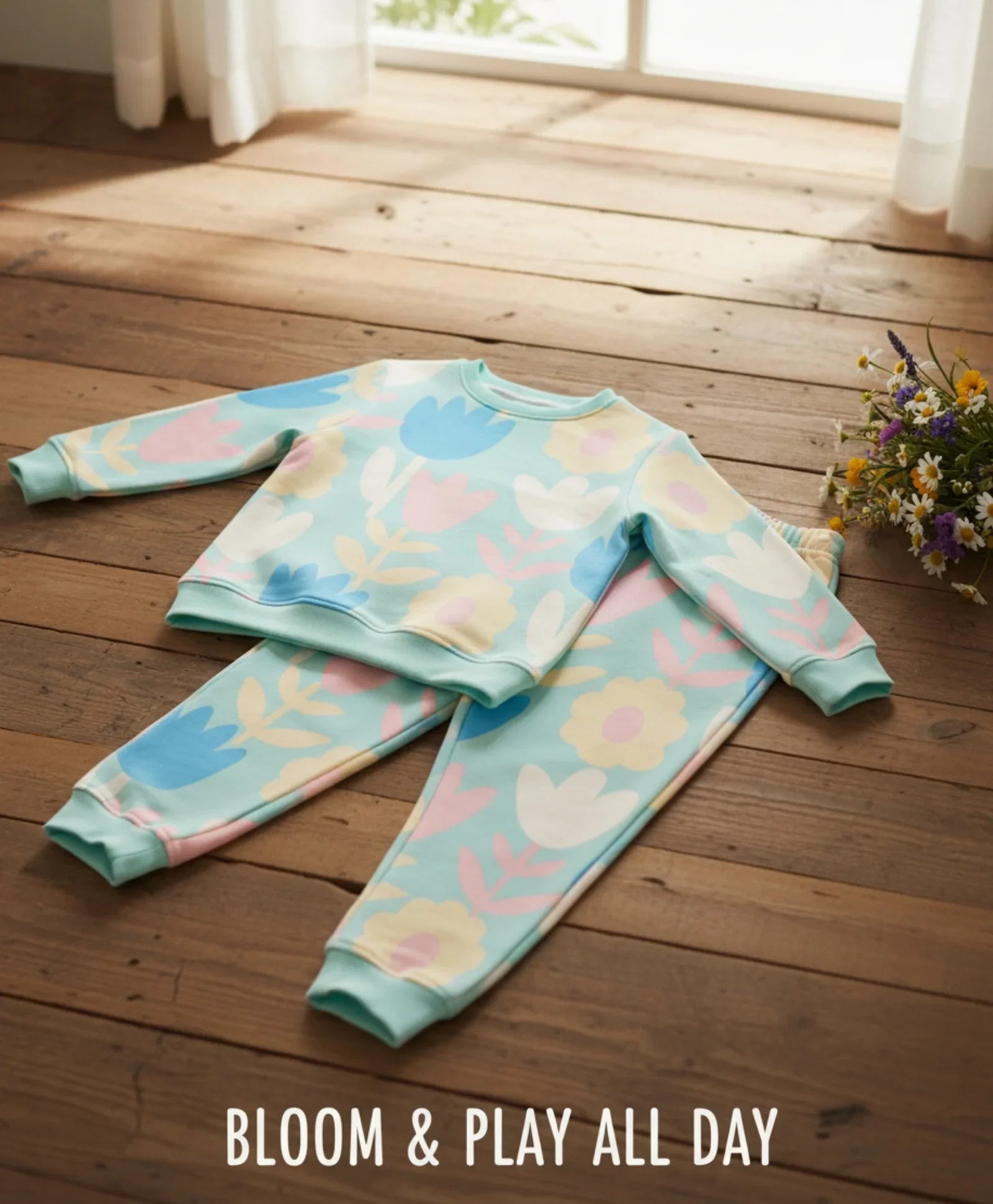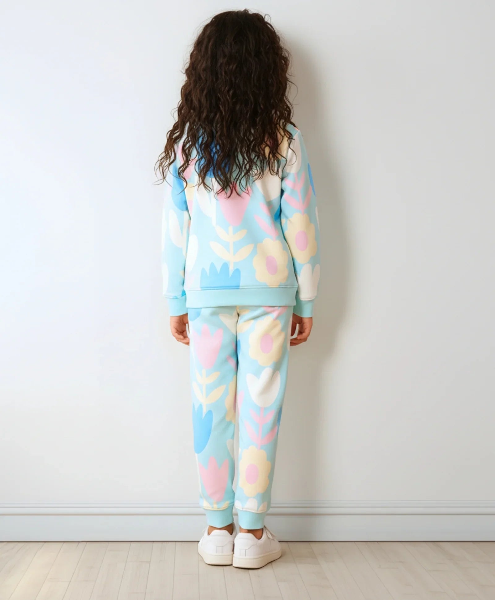 The Aqua Flower Fleece Girls Sweatshirt Jogger Set brings comfort and charm to her everyday style. Crafted from soft fleece fabric, the sweatshirt showcases a pretty floral design that pairs beautifully with the matching joggers. Cozy yet lightweight, this set is perfect for school, playdates, or lounging. A stylish choice for cooler days.
