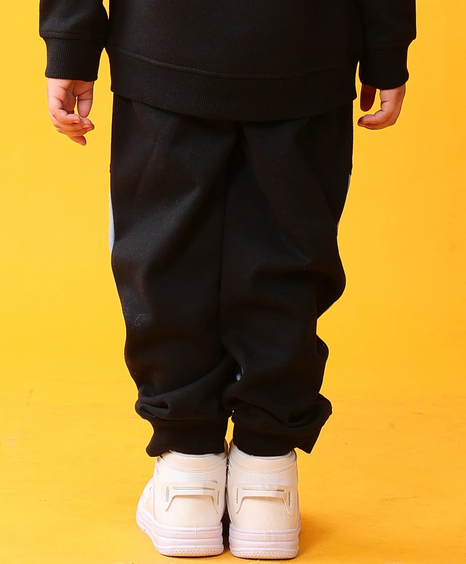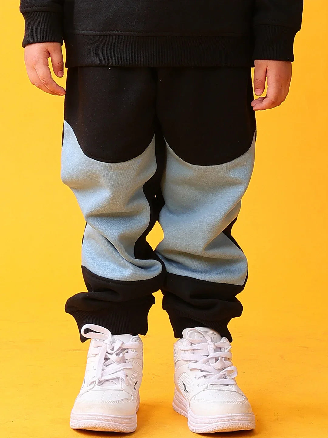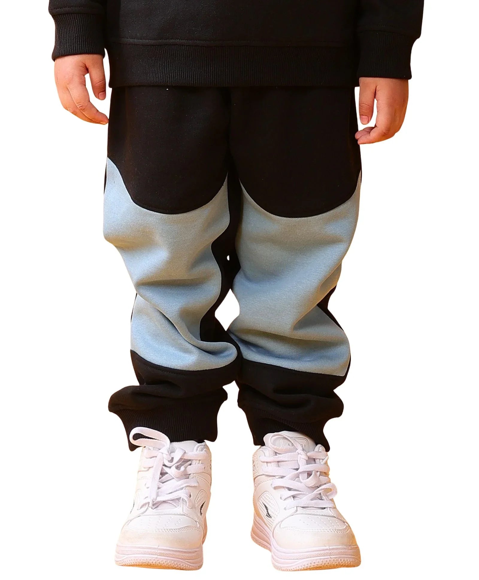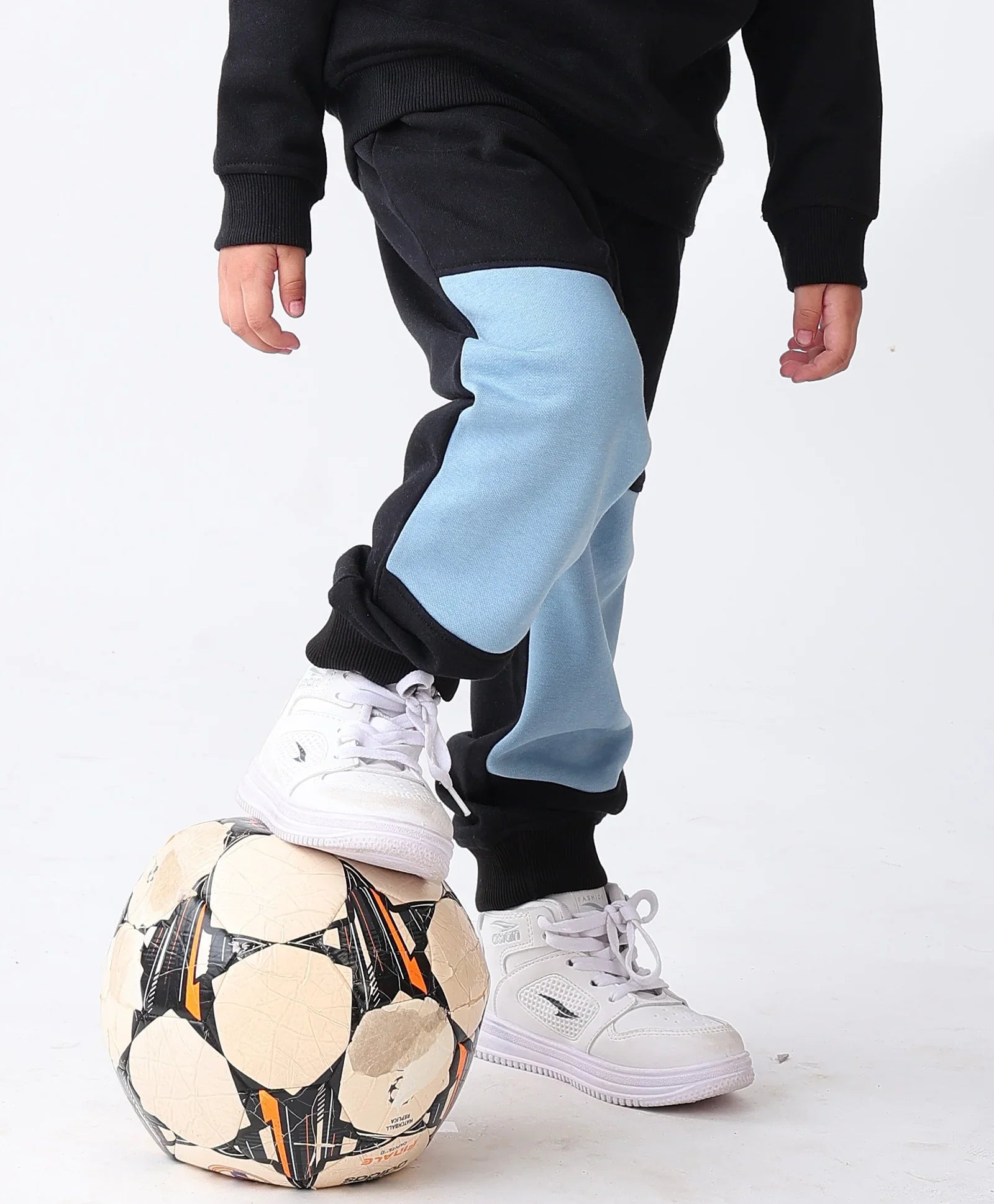 The Black Blue Interlock Boys Fleece Jogger is crafted from soft fleece fabric for all-day warmth and comfort. Featuring a stylish black base with blue panel accents, it includes an elastic waistband and ribbed cuffs for a snug fit. Perfect for playtime or casual outings, these joggers combine function with a sporty, modern look