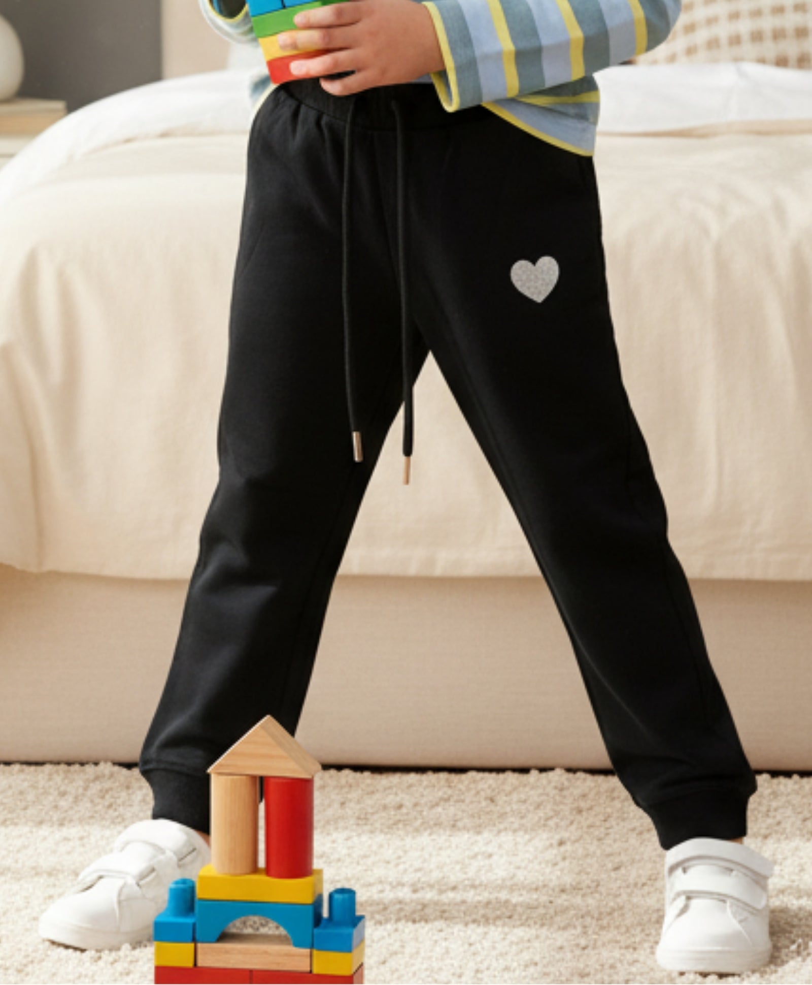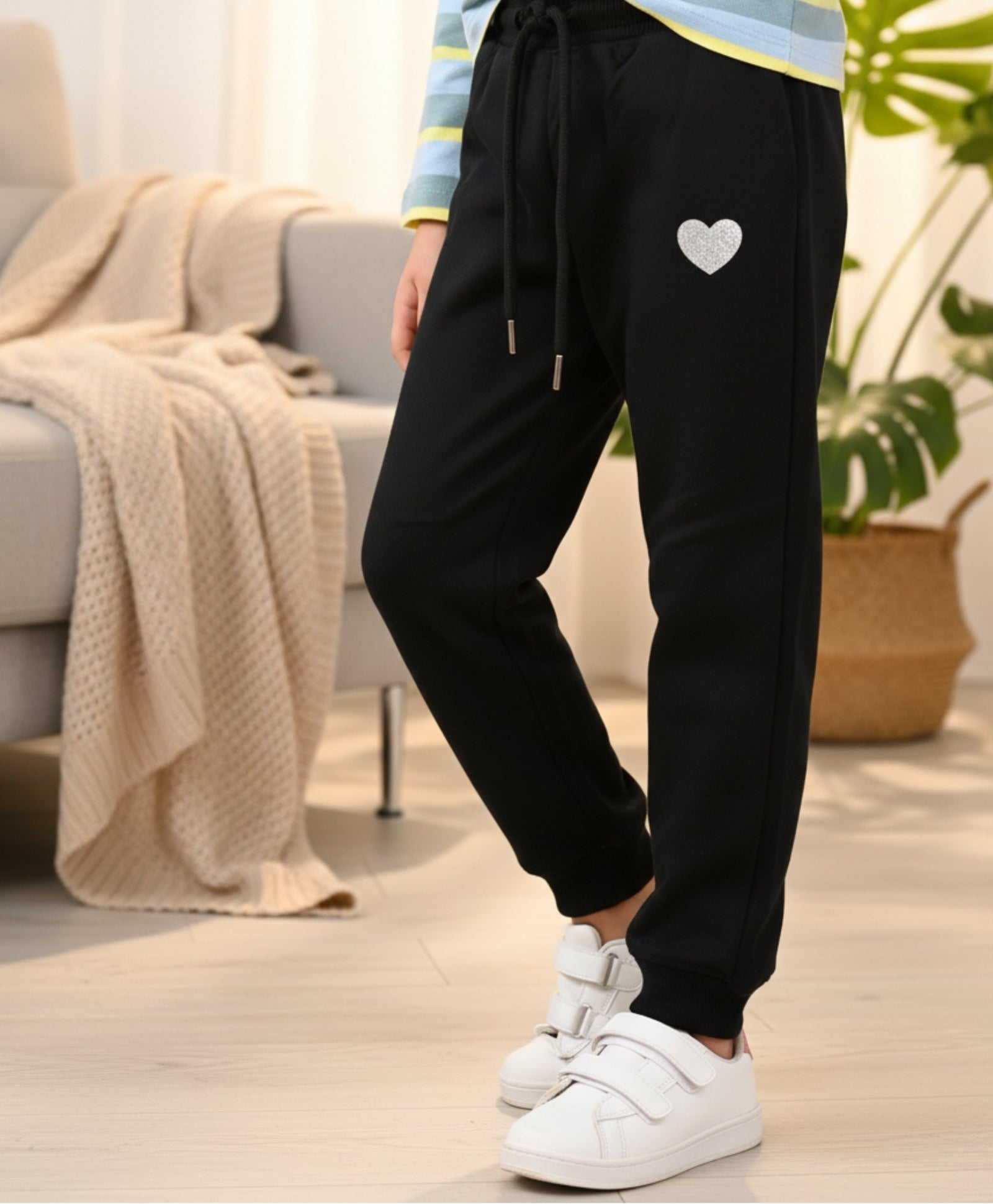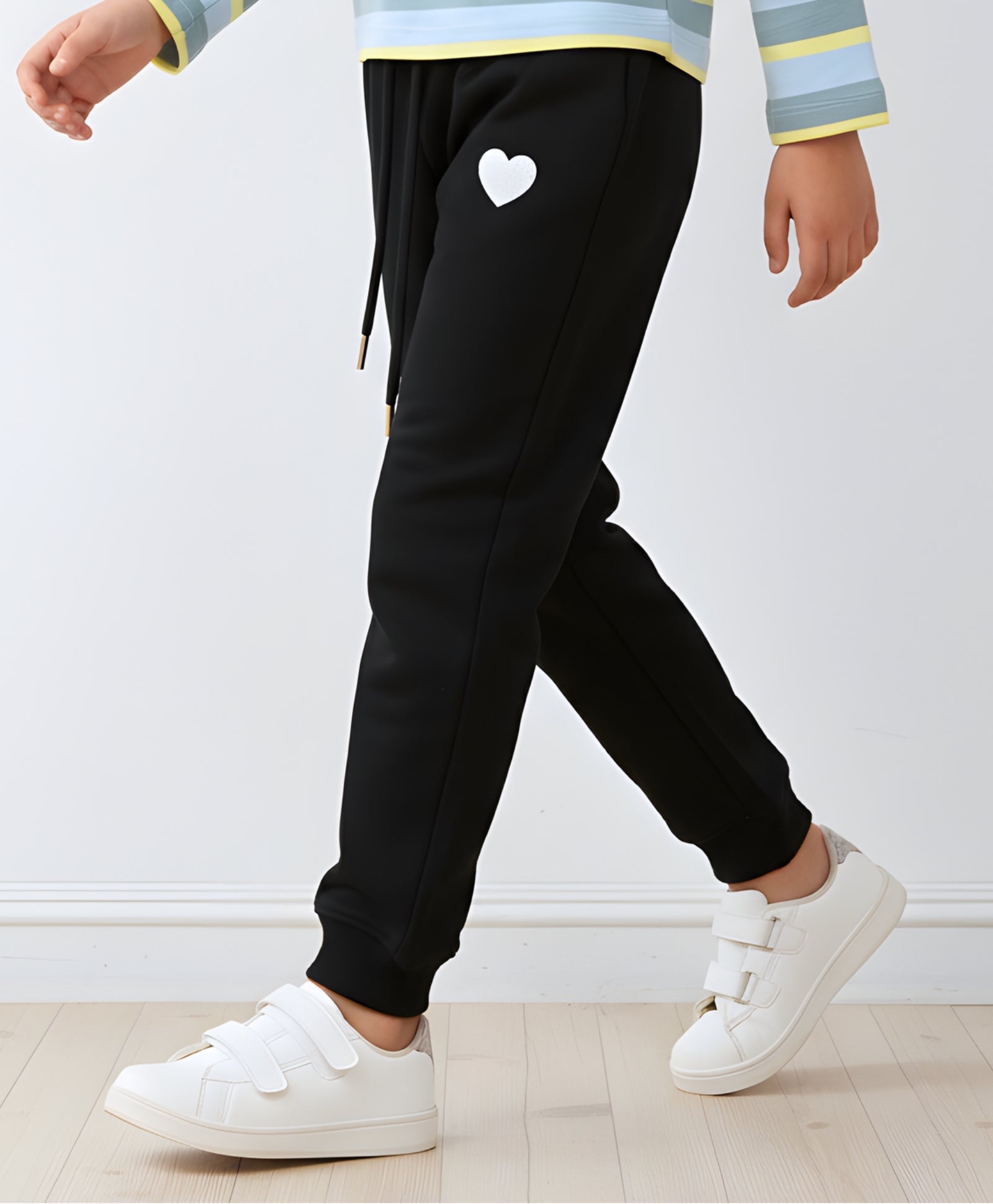 These black fleece joggers with a sweet heart design and adjustable drawstring are both stylish and cozy! Ideal for cooler days, they offer the perfect fit for staying active or just lounging around. Super soft and warm, these joggers are a must-have for girls who want both comfort and charm in their wardrobe.
