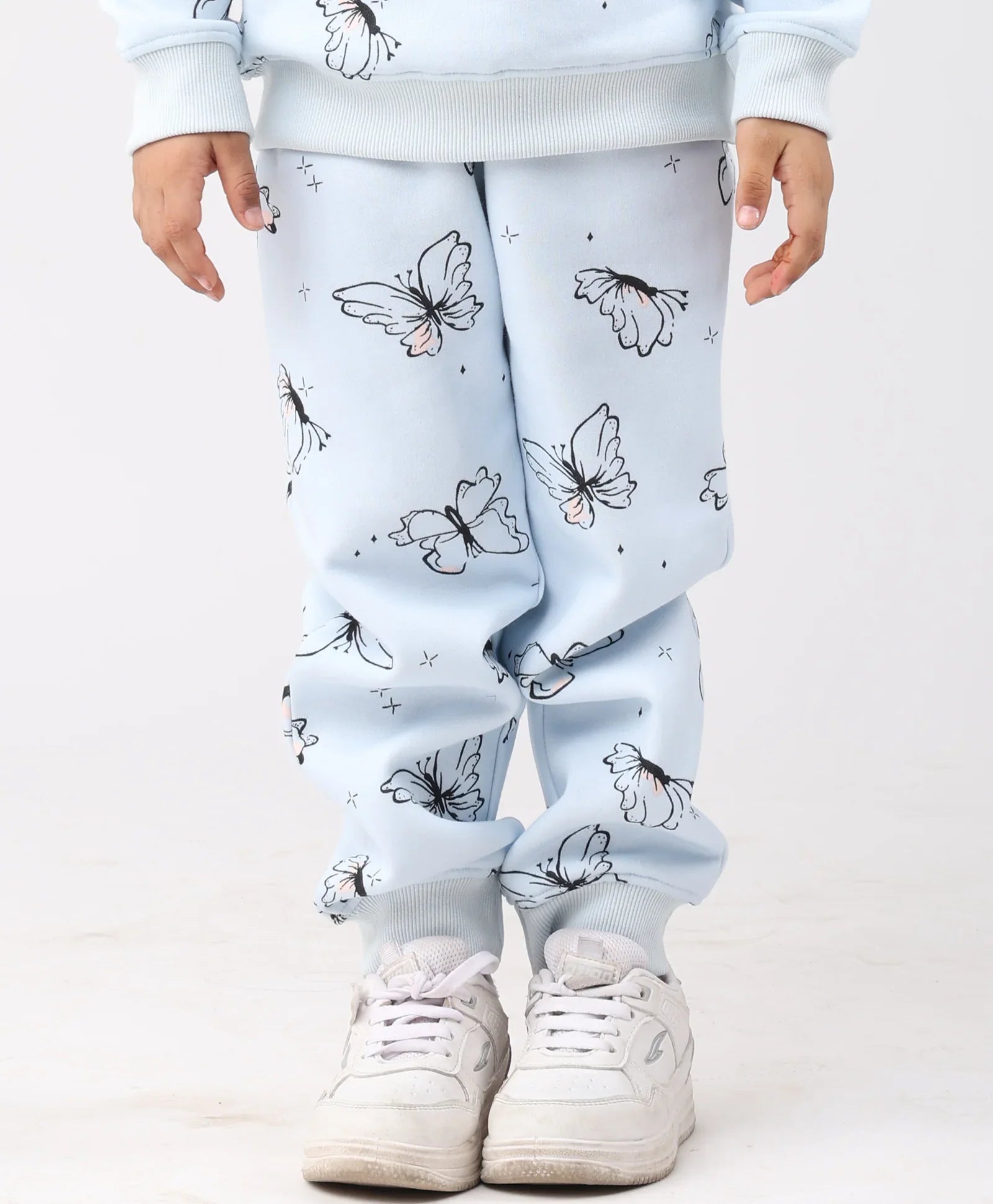 Blossom into cozy style with the BLUE BUTTERFLY FLEECE GIRLS JOGGER - BLUE. These sweet joggers feature a vibrant, ALL OVER PRINTED pattern of delicate blue butterflies fluttering across the soft fabric. Crafted from warm fleece, they ensure ultimate snuggliness and a light, airy look for everyday comfort.
