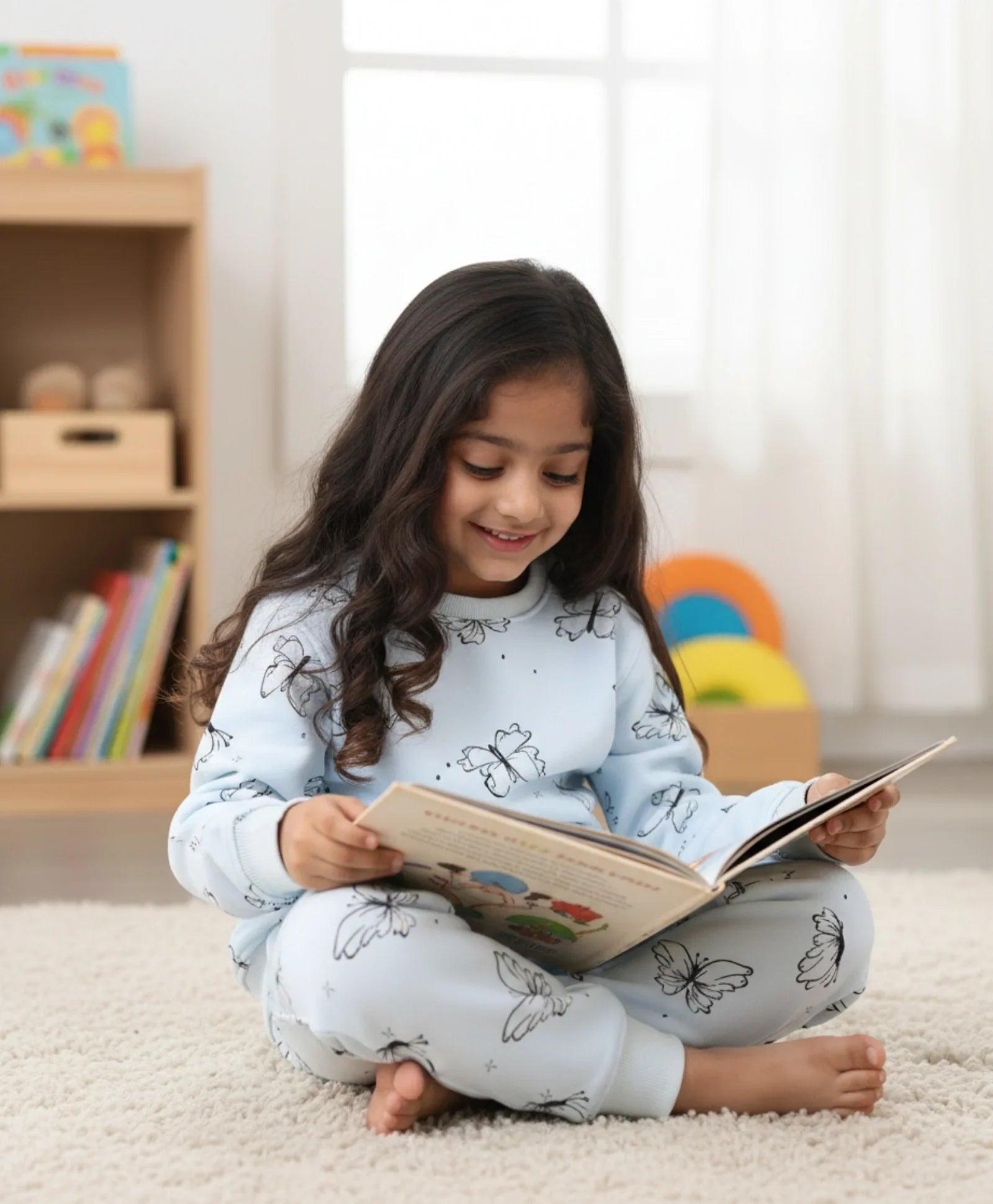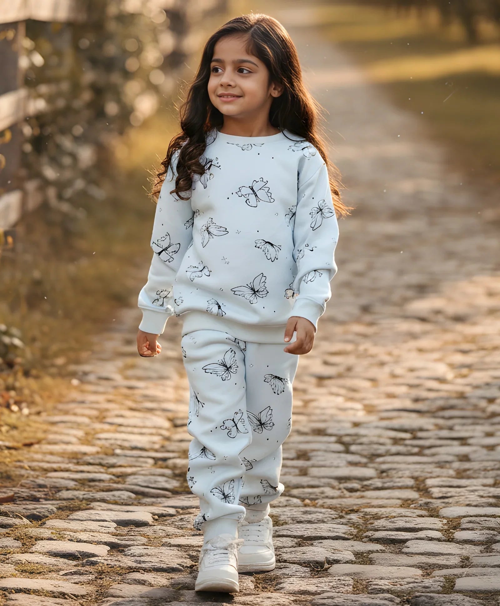 This Butterfly Blue Fleece Girls Sweatshirt Jogger Set is made from soft, warm fleece fabric, perfect for cooler days. The blue sweatshirt features a charming butterfly design, while the joggers offer a comfortable elastic waistband and cuffed ankles. Ideal for playtime or casual wear, this cozy set keeps kids stylish and snug all day long.