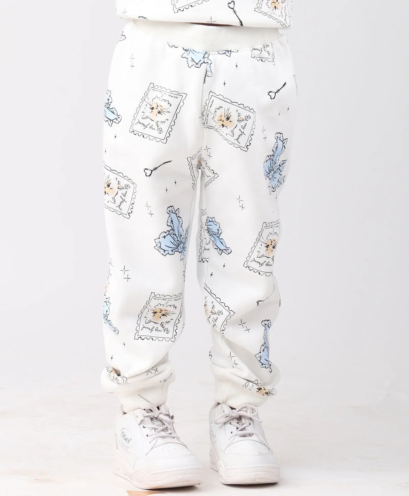 Bounce into blissful comfort with the BOW KEY CAT GIRLS FLEECE JOGGER - WHITE. These charming joggers feature an adorable, ALL OVER PRINTED design of cats with cute bows and keys on a bright white background. Crafted from soft fleece, they promise cozy warmth and the purr-fect relaxed fit.