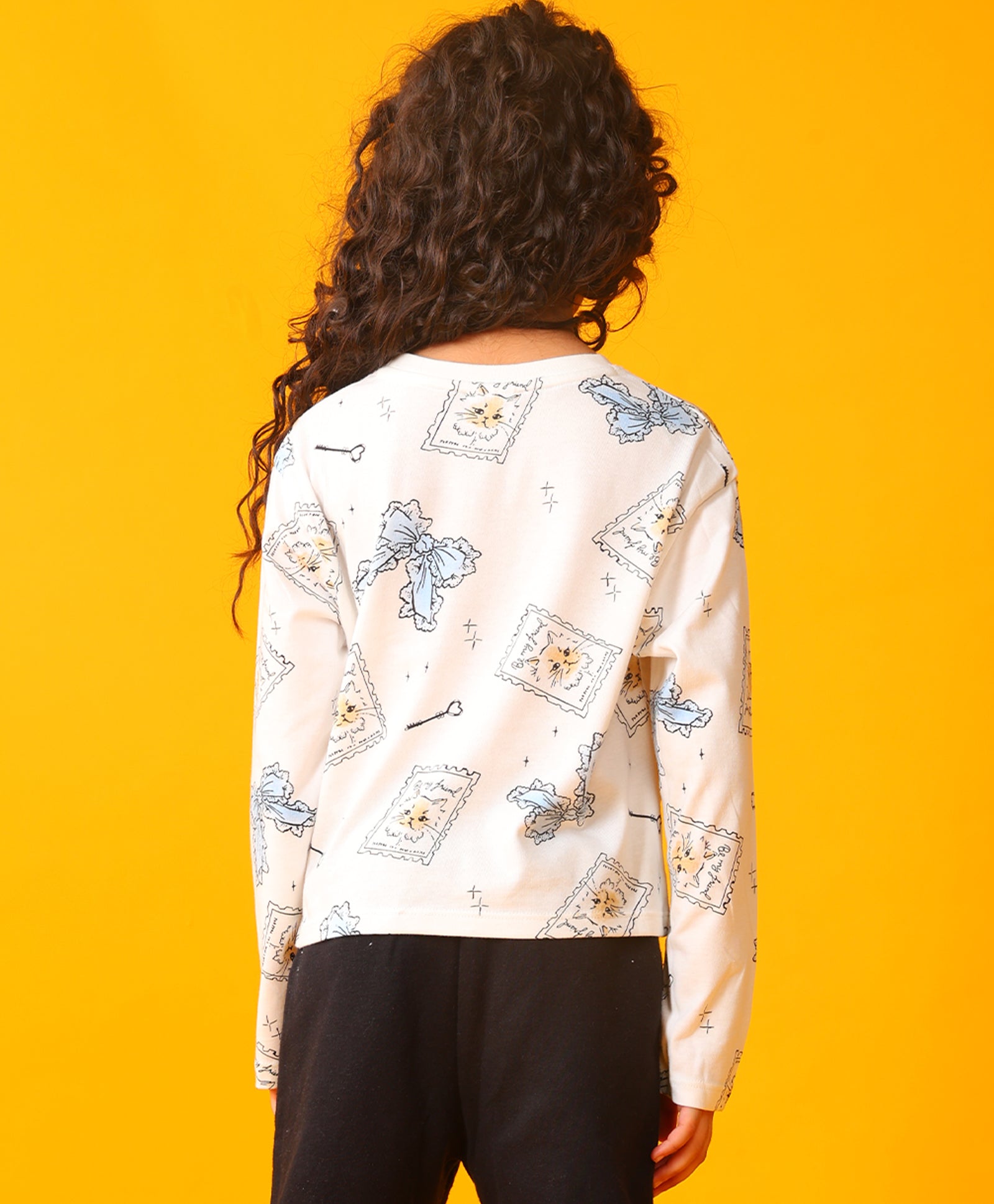 BOW KEY CAT LONG SLEEVE GIRLS T-SHIRT - WHITE