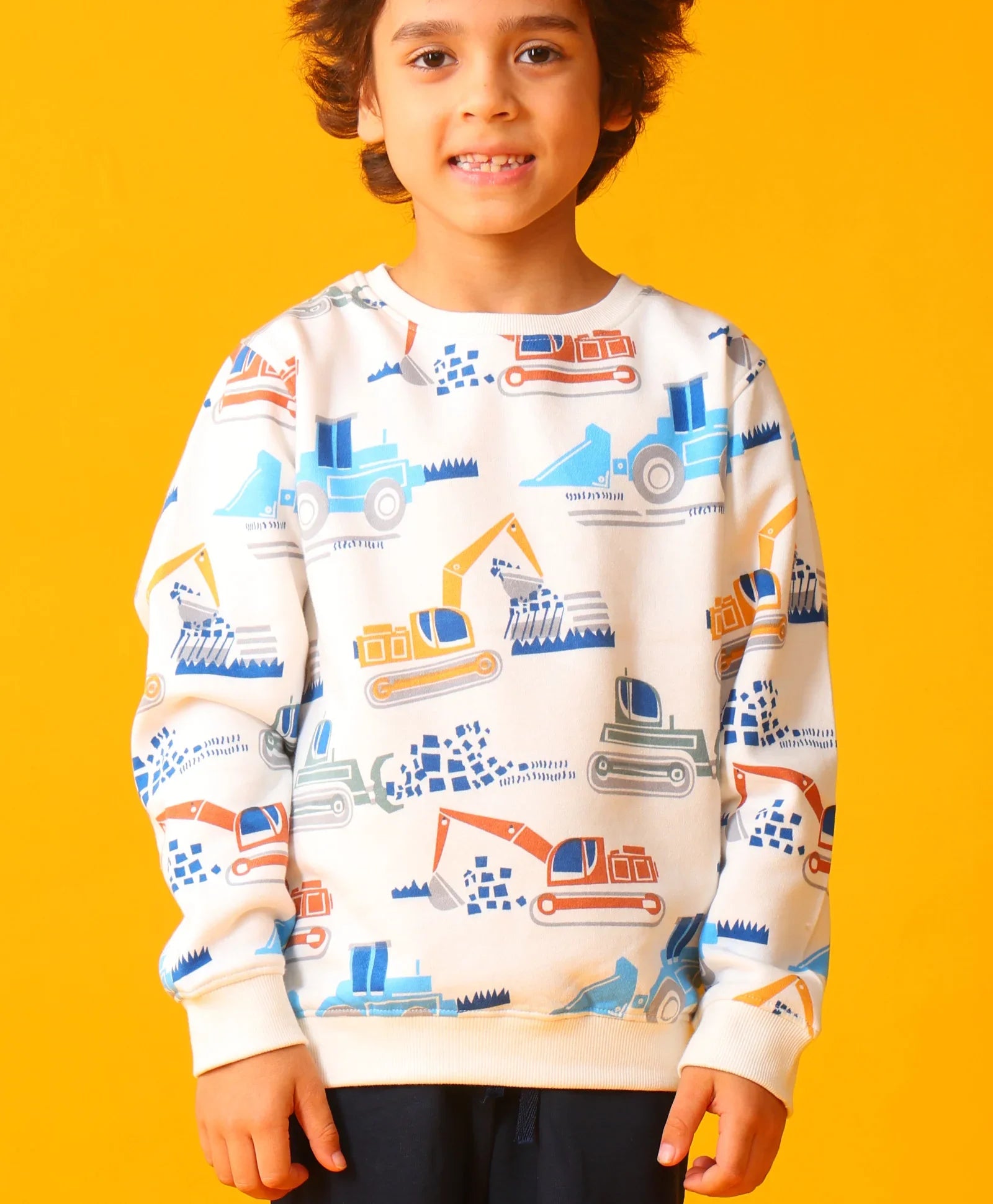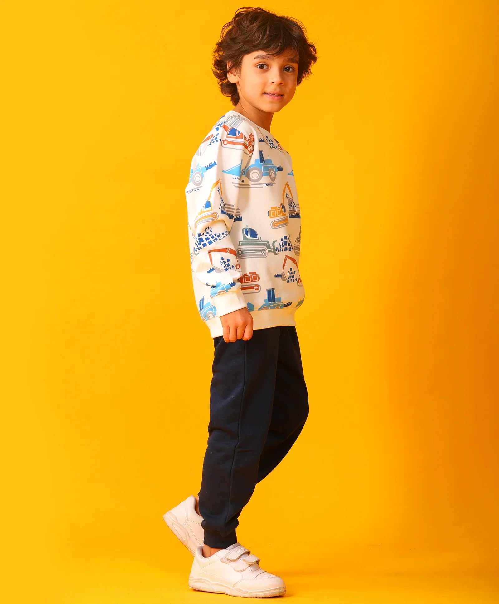DIGGER PRINT BOYS FLEECE SWEATSHIRT NAVY JOGGER SET - OFF WHITE/NAVY