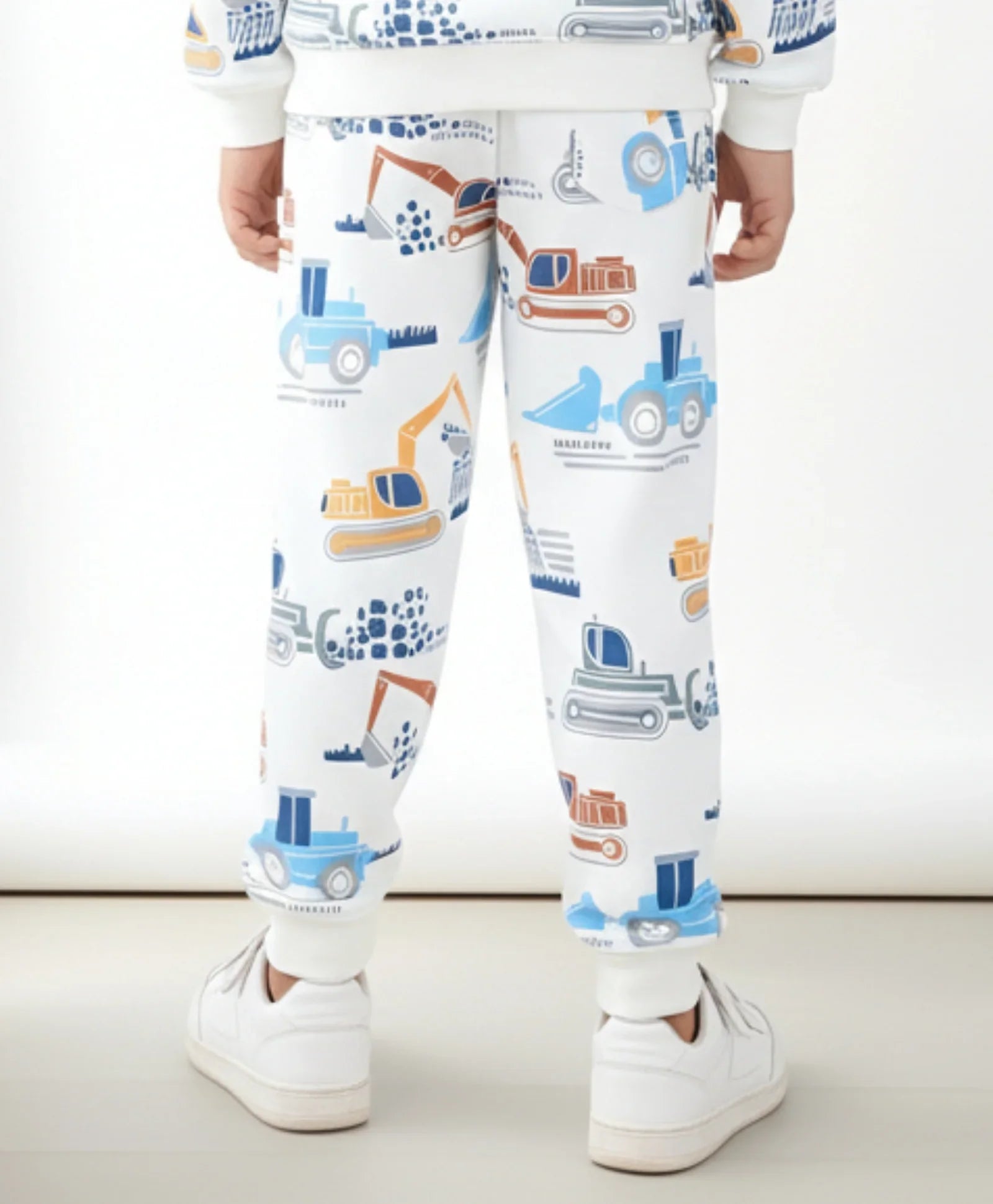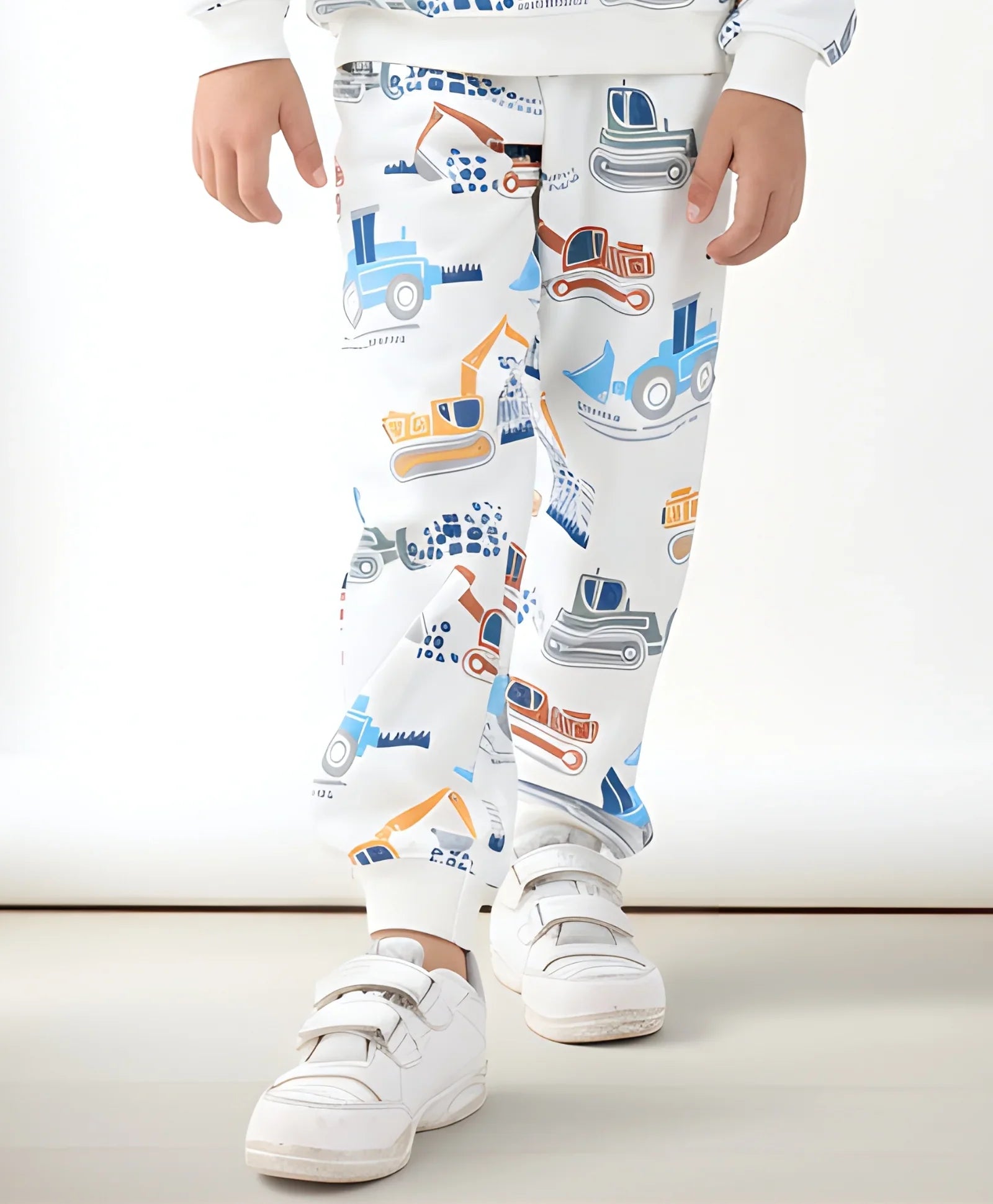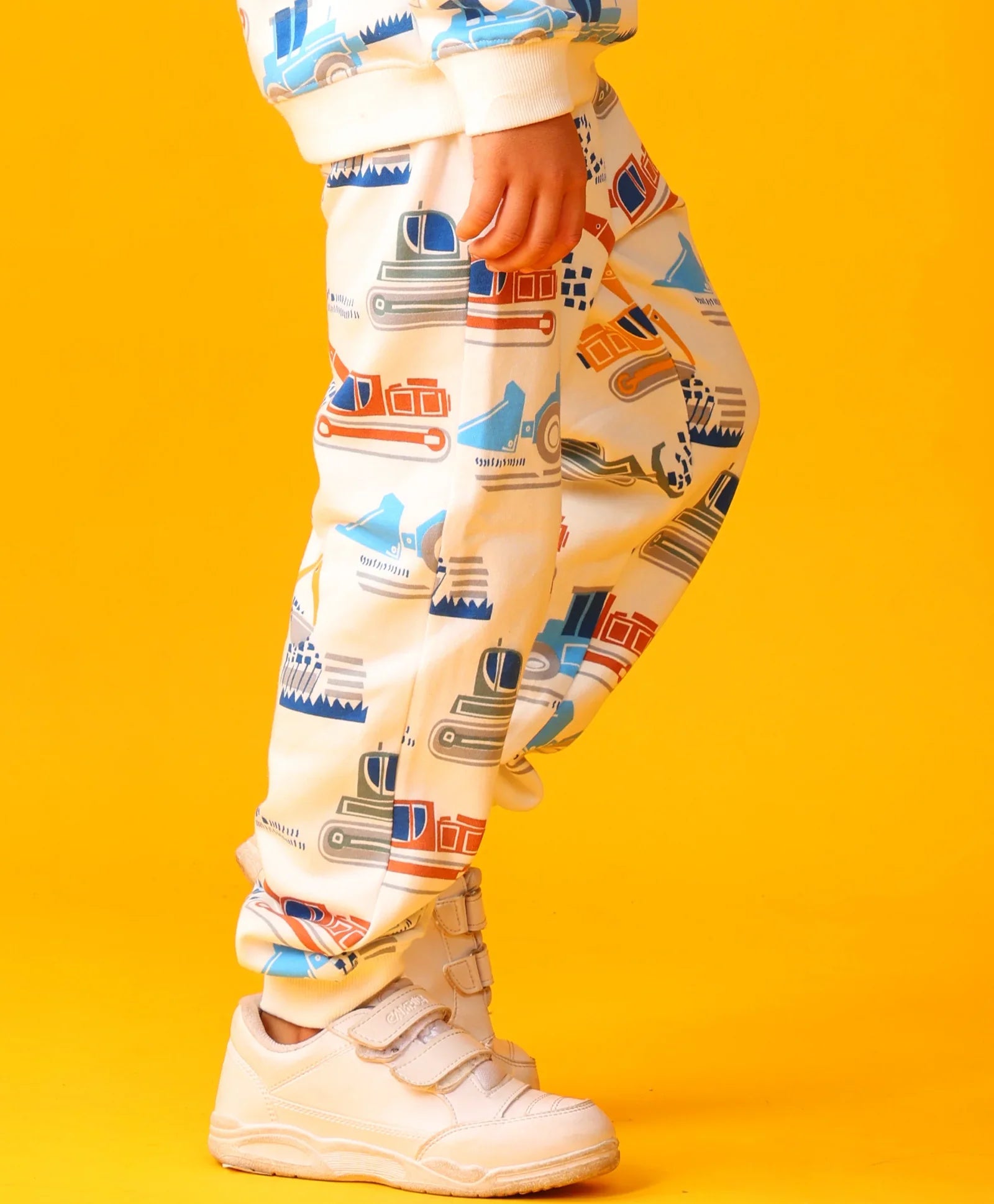 Drive into comfort with the DIGGER PRINT FLEECE BOYS JOGGER - OFF WHITE. These cool joggers boast a dynamic, ALL OVER PRINTED pattern of heavy construction machinery across the soft fabric. Made from warm FLEECE, they ensure supreme coziness and a hardworking, adventurous style for building fun all day long.