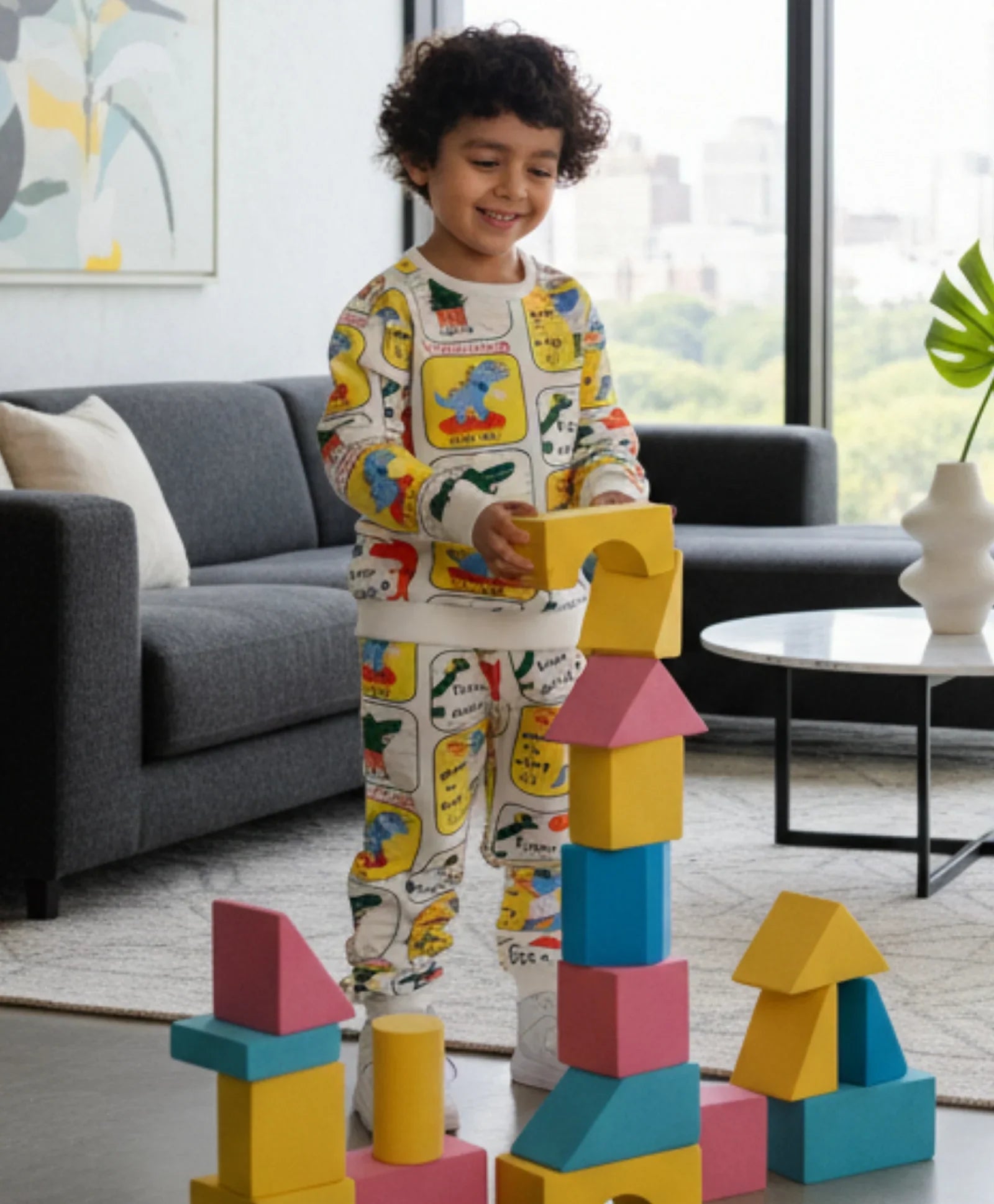 This cozy boys’ set features a soft fleece sweatshirt and joggers in off-white, with a fun dinosaur stamp design. Perfect for keeping kids warm and comfortable during play or casual outings. The elastic waistband and ribbed cuffs ensure a snug fit, while the durable fabric is easy to care for.