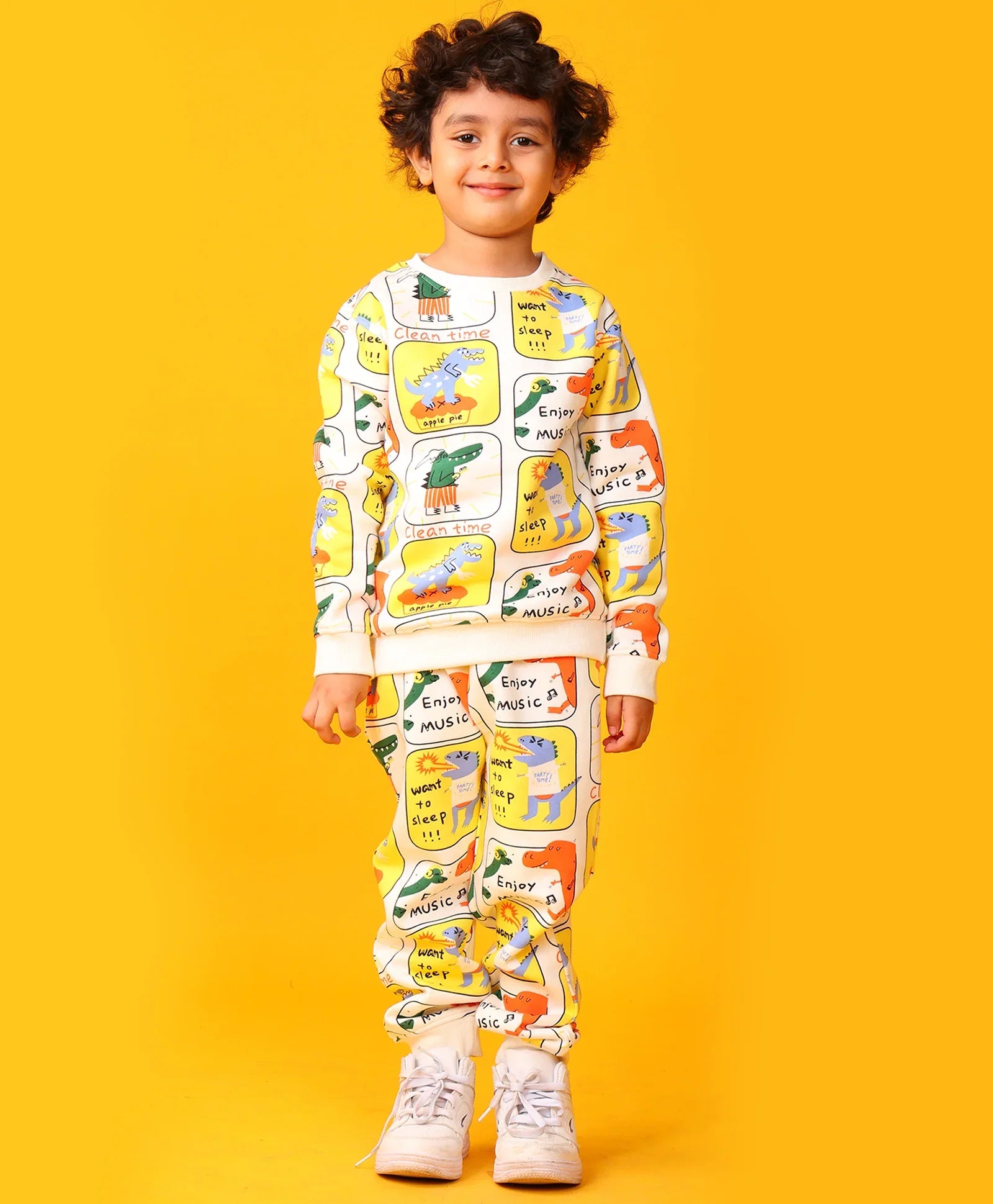 DINOSAUR STAMP FLEECE BOYS SWEATSHIRT JOGGER SET - OFF WHITE