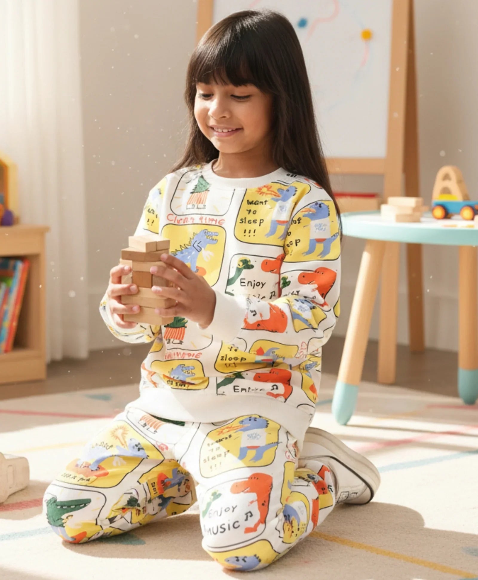This Dinosaur Stamp Fleece Girls Sweatshirt Jogger Set in off white is a cozy and stylish choice for kids. Made from soft fleece fabric, it provides warmth and all-day comfort. The sweatshirt features fun dinosaur stamp prints, paired with matching joggers for a complete look. Perfect for playtime, outings, or lounging, it combines cuteness with casual ease.