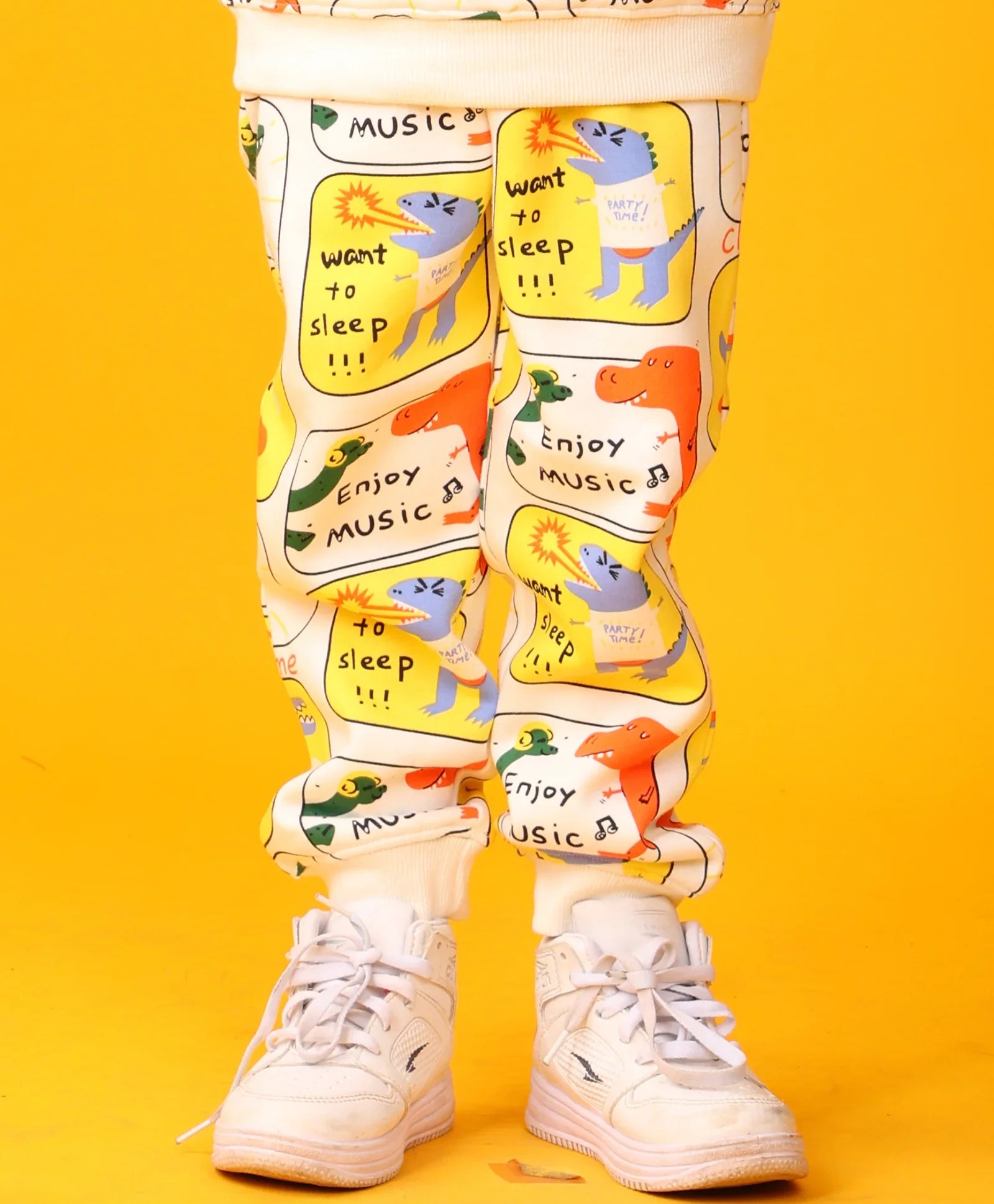 Dig into roaring comfort with the DINOSAUR STAMP FLEECE BOYS JOGGER - OFF WHITE. These cool joggers feature a fantastic, ALL OVER PRINTED pattern of dinosaur stamps across the soft white fabric. Made from warm FLEECE, they offer supreme coziness and a prehistoric, adventurous look for active boys.
