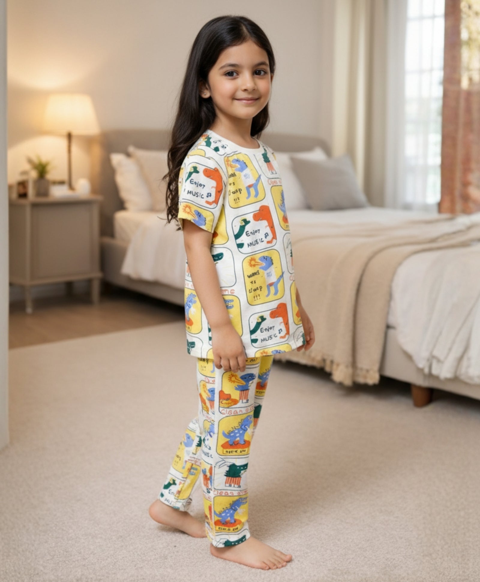 Brighten up bedtime with this Dinosaur Stamp Pyjama Set in vibrant yellow. Featuring adorable prehistoric prints, this soft, short-sleeve set keeps her cool and comfy. The stretchy waistband ensures a perfect fit for every stomping good dream and morning adventure.