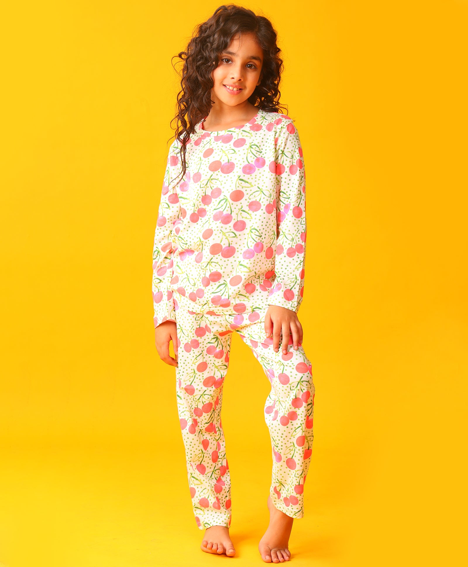 Add sweetness to bedtime with this adorable Dotted Cherry Long Sleeve Pyjama Set for kids. Made from 100% pure cotton, it features a playful cherry and dot print on soft off-white fabric. With ribbed cuffs and an elastic waistband, it offers all-night comfort for sleep or lounging. Perfect for cozy nights and weekend mornings.