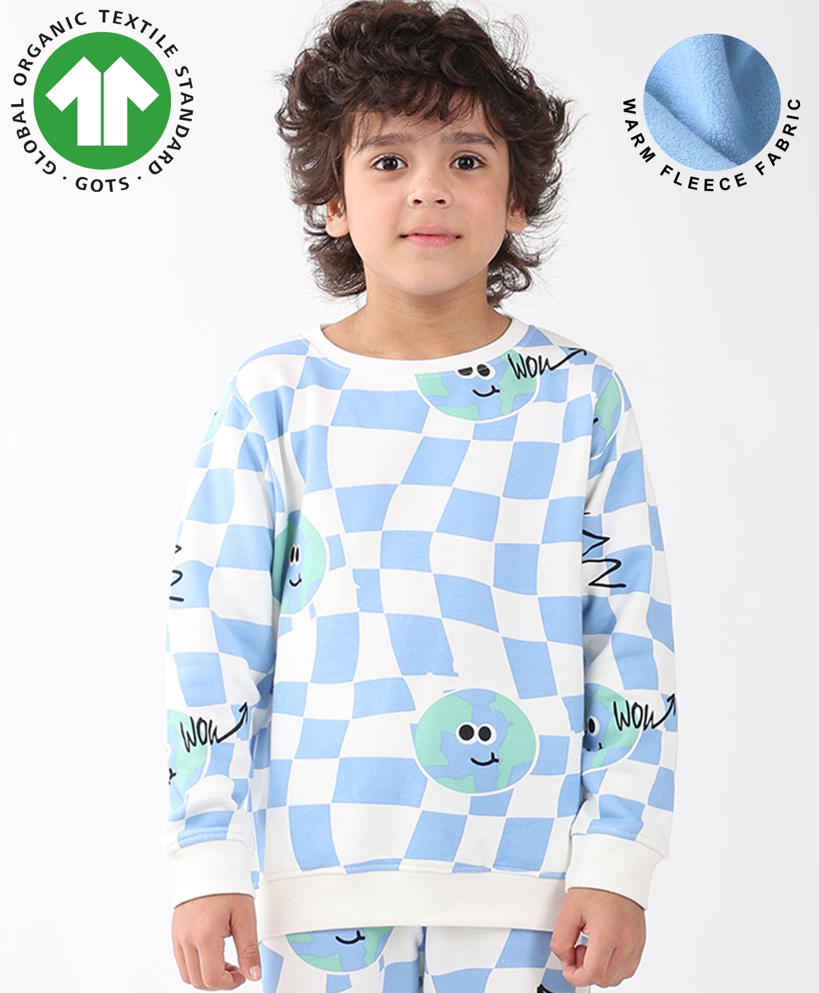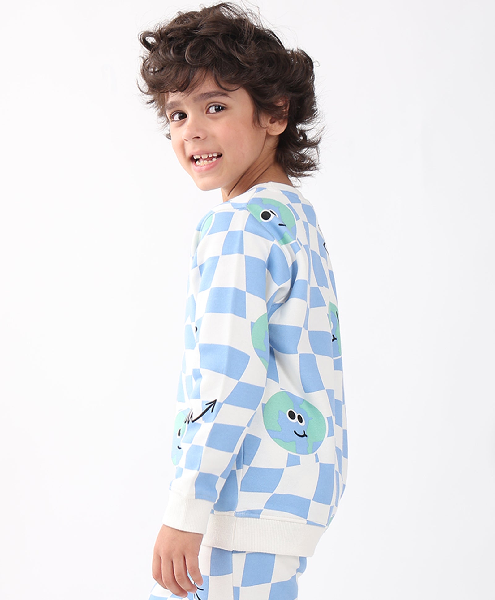 Unleash a wave of cozy cool with the GLOBE CHECK BOYS FLEECE SWEATSHIRT - BLUE. This super-soft fleece features a vibrant, ALL OVER PRINTED check pattern that guarantees standout style. Perfect for playground adventures or simply chilling, it offers warmth, comfort, and undeniable flair for your young explorer.