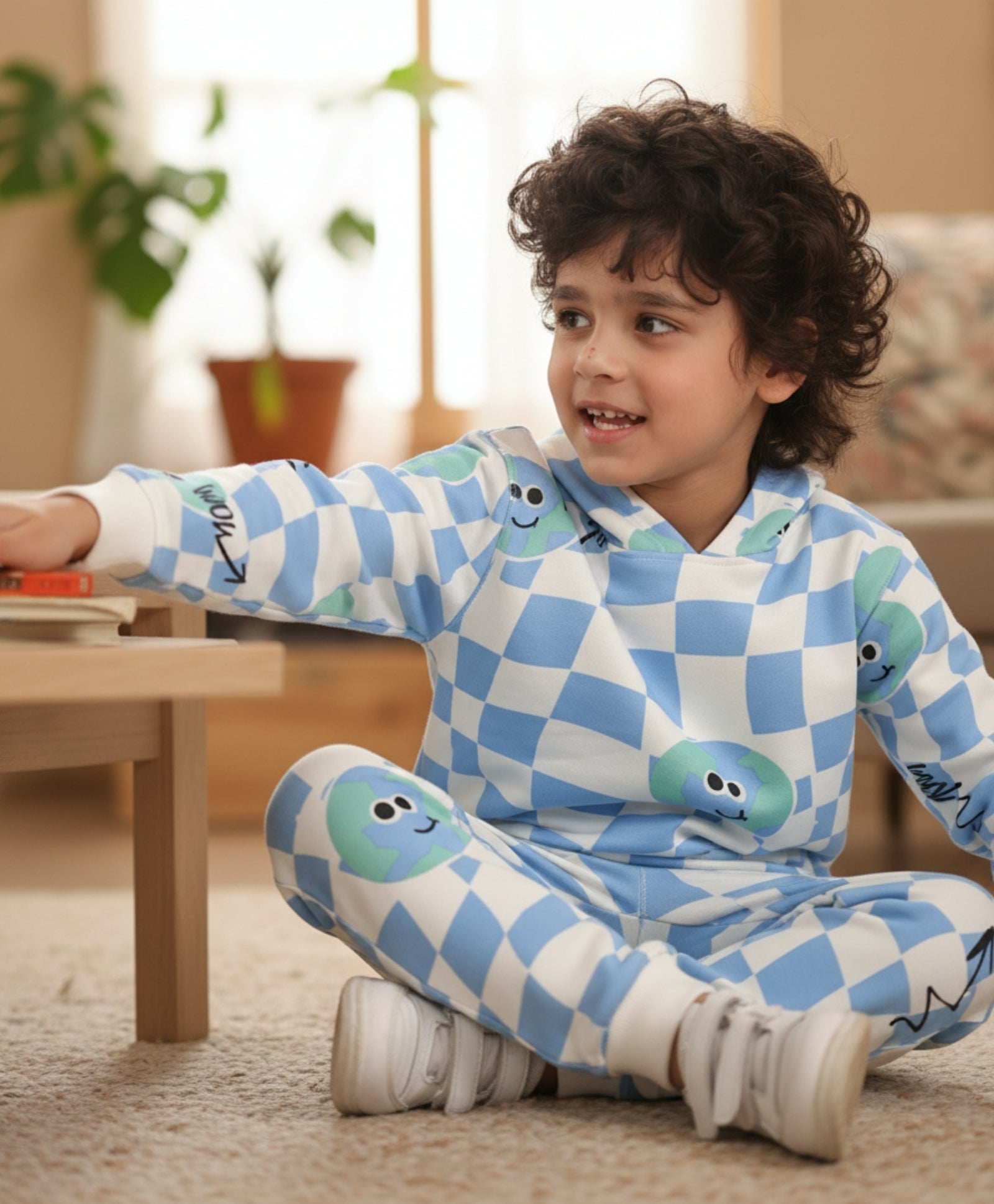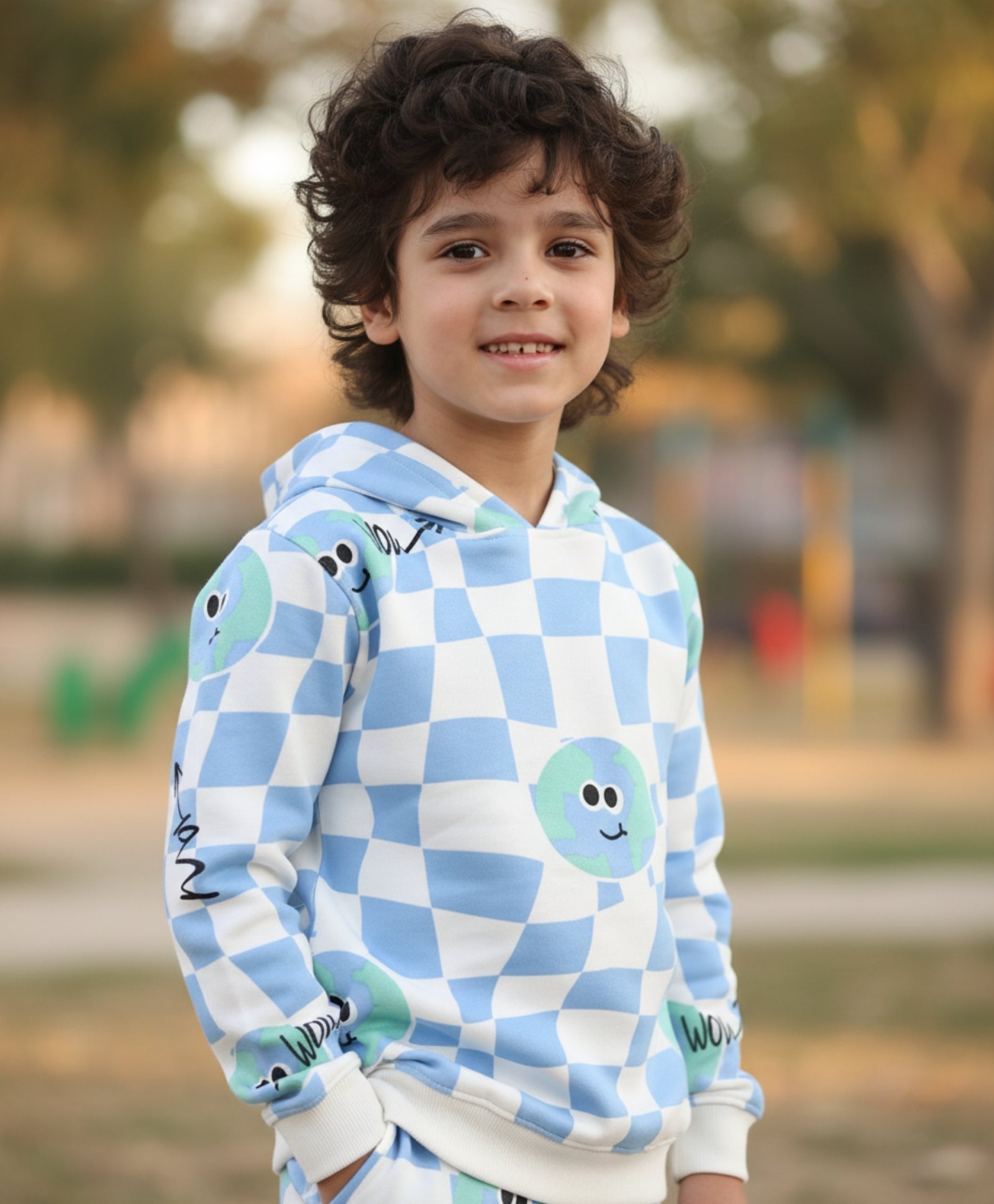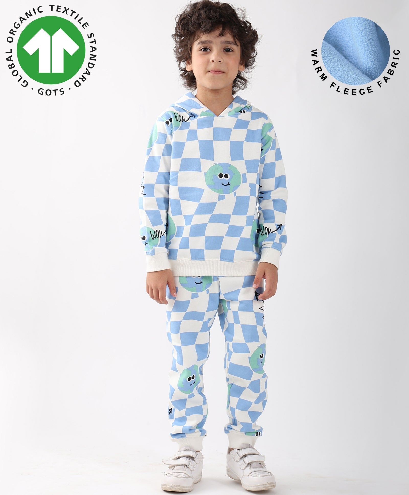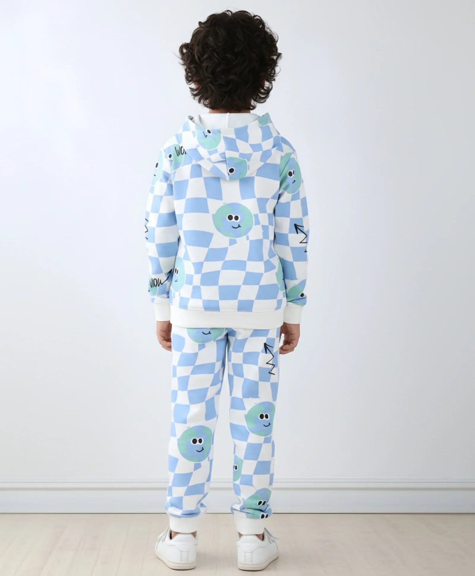 This Globe Check Fleece Boys Hoodie Jogger Set in off-white is crafted from soft fleece fabric, ensuring warmth and comfort for cooler days. The hoodie features a trendy globe check design, paired with matching joggers for a stylish coordinated look. Perfect for school, play, or casual outings, this set offers both coziness and everyday style for kids.