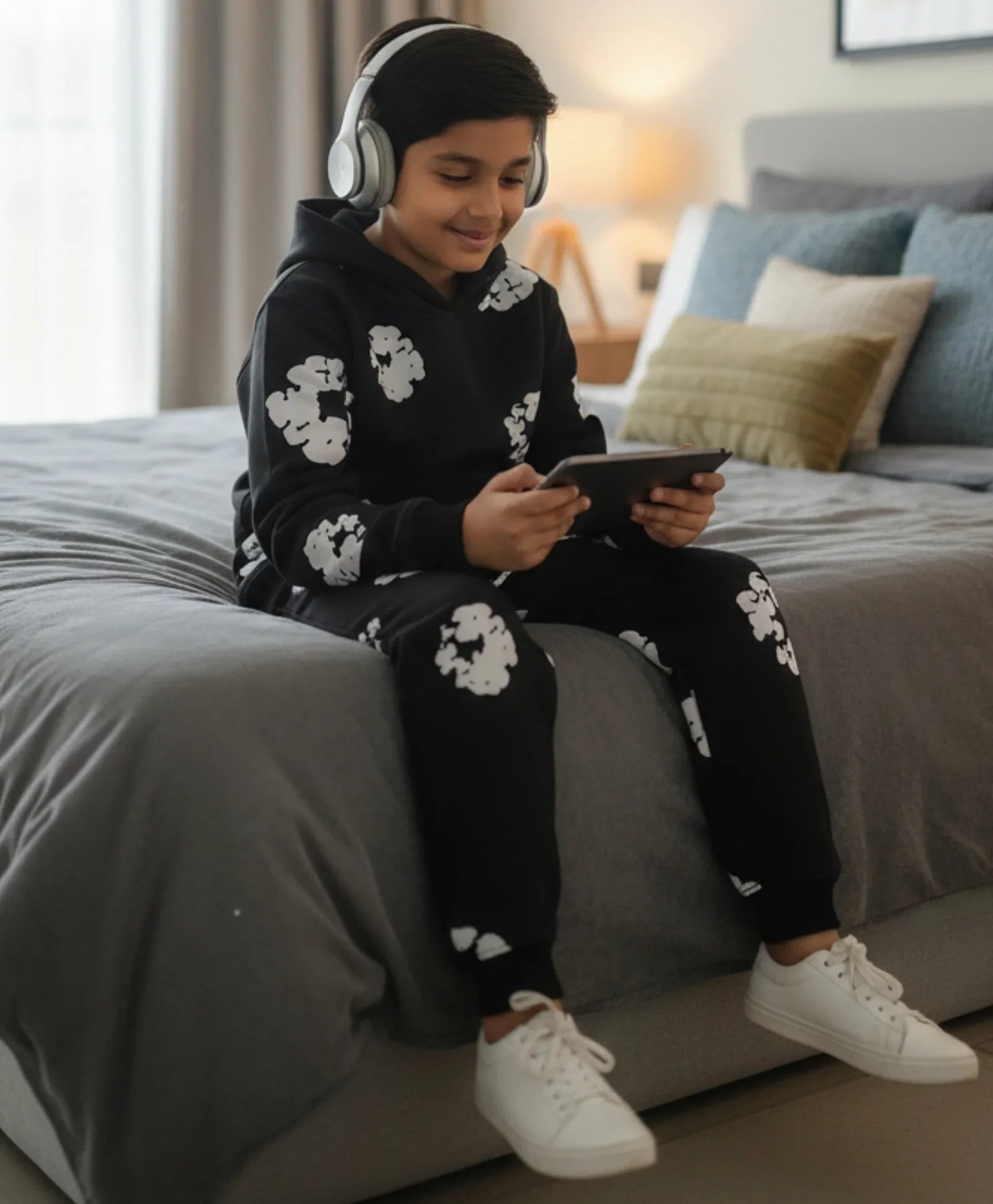 This cool POP Black & White Boys Fleece Hoodie Jogger Set delivers instant coordinated street style. Featuring a cozy black hoodie with a bold white "POP" graphic and matching black fleece joggers, it offers ultimate comfort and warmth. Perfect for play, school, or lounging, this set is a must-have for effortless kid style.