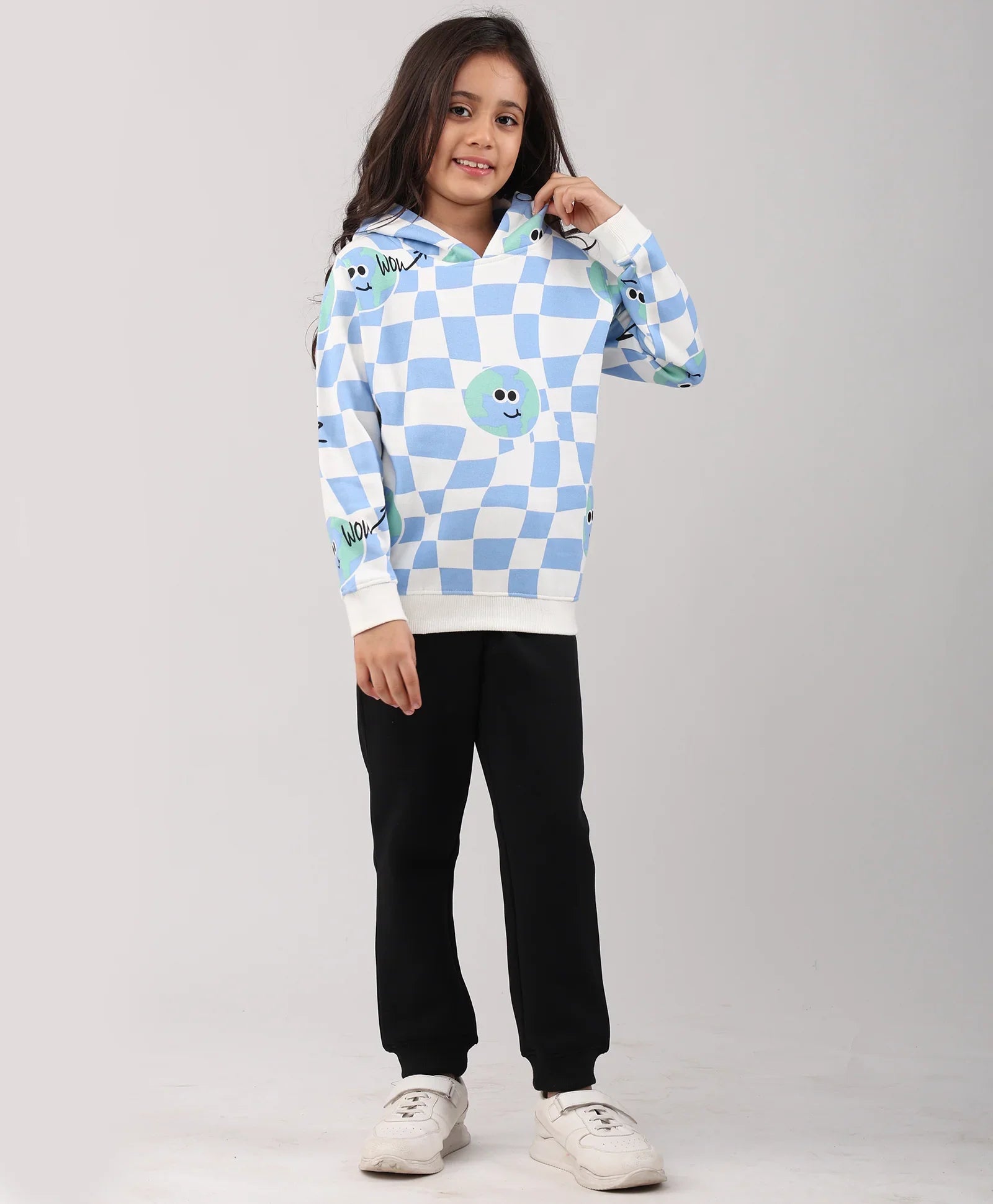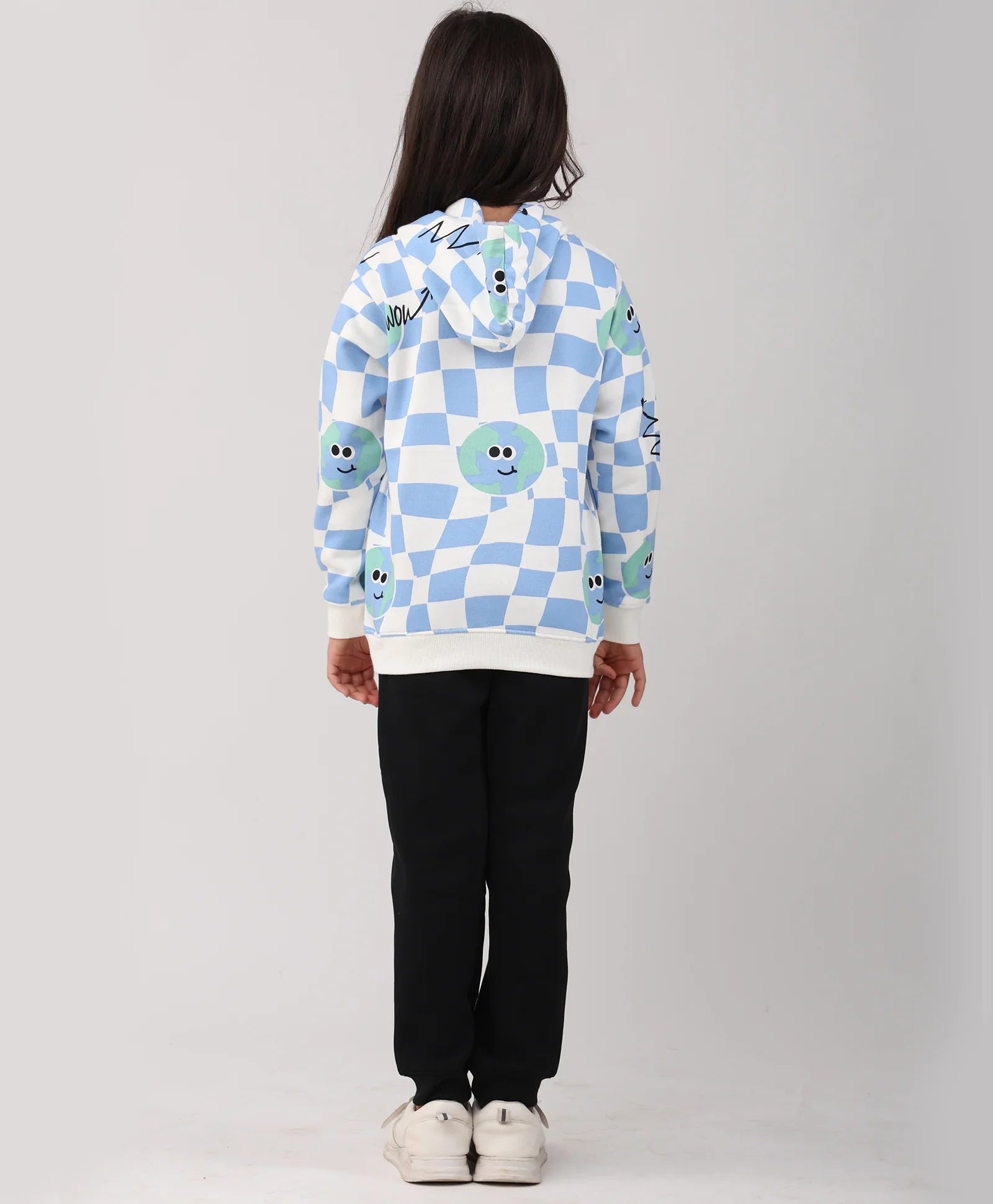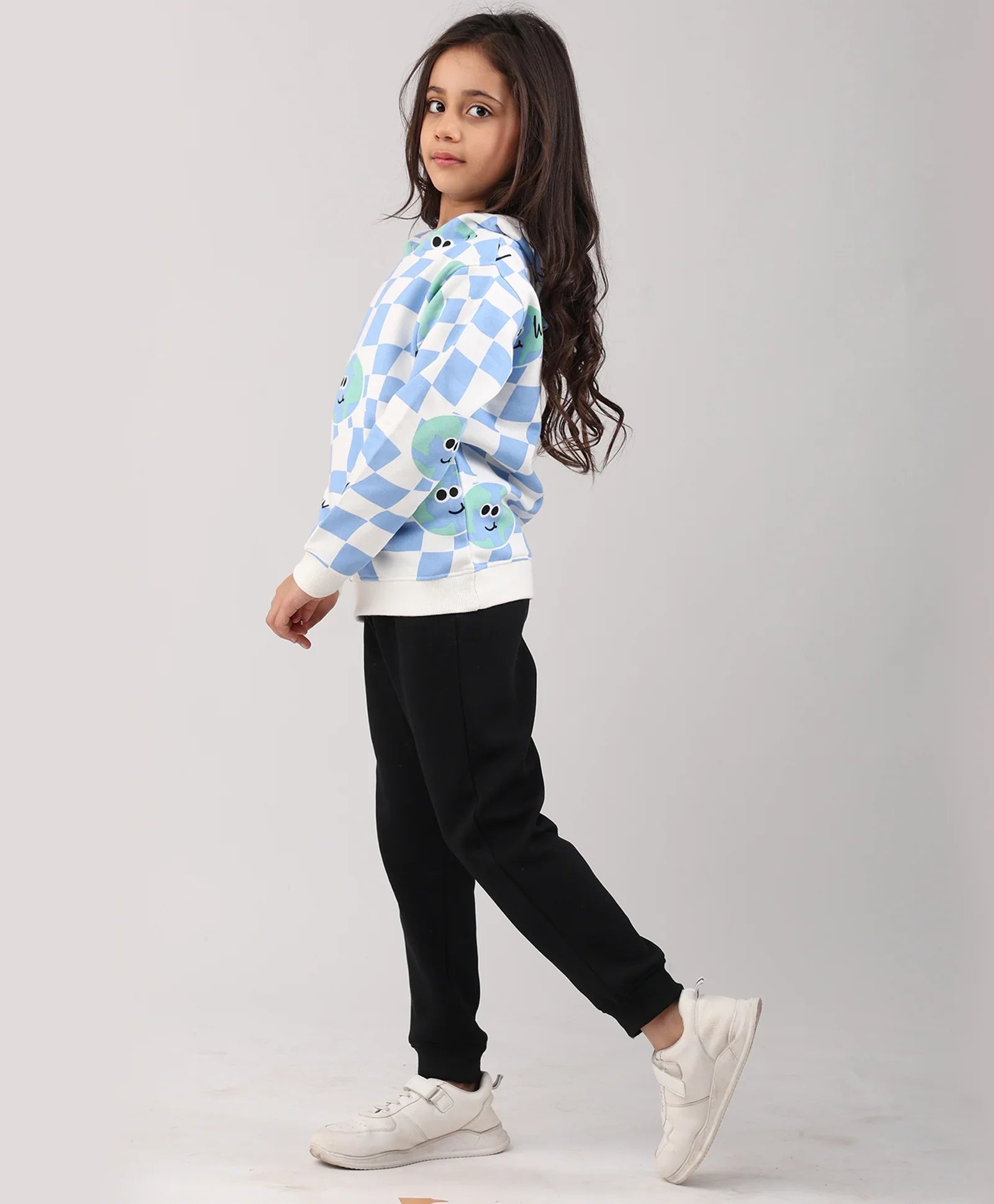 The Globe Check Girls Fleece Hoodie Black Jogger Set in blue and black is designed for comfort and style. Made from soft fleece fabric, it offers warmth and durability for everyday wear. The globe check print hoodie pairs perfectly with solid black joggers, creating a trendy yet cozy outfit. Ideal for school, outings, or lounging in comfort.