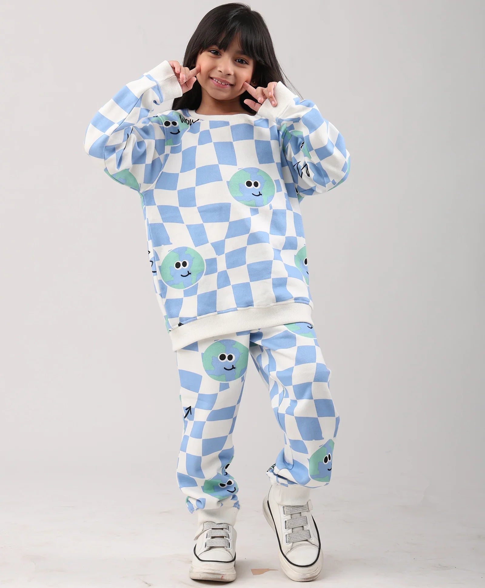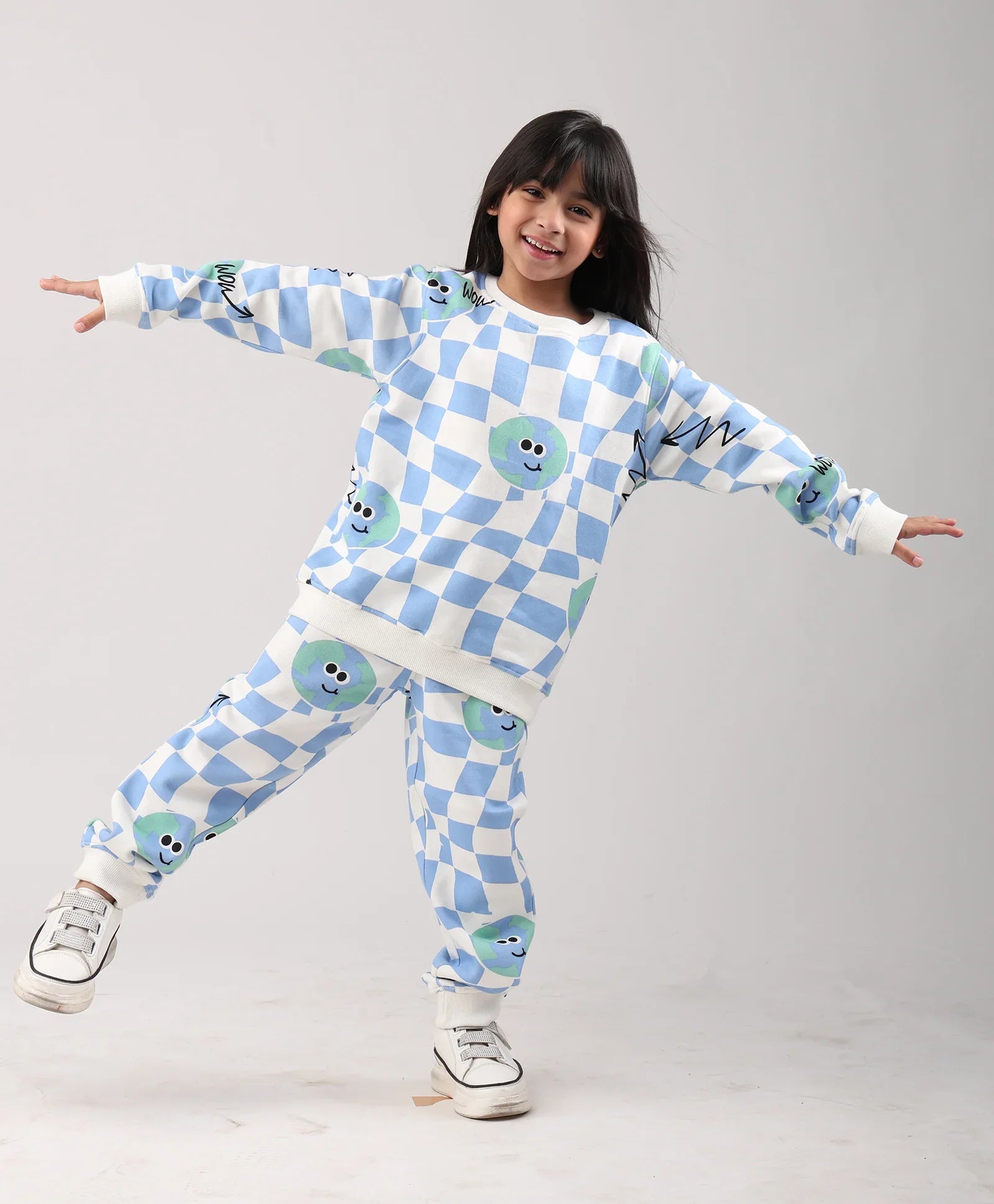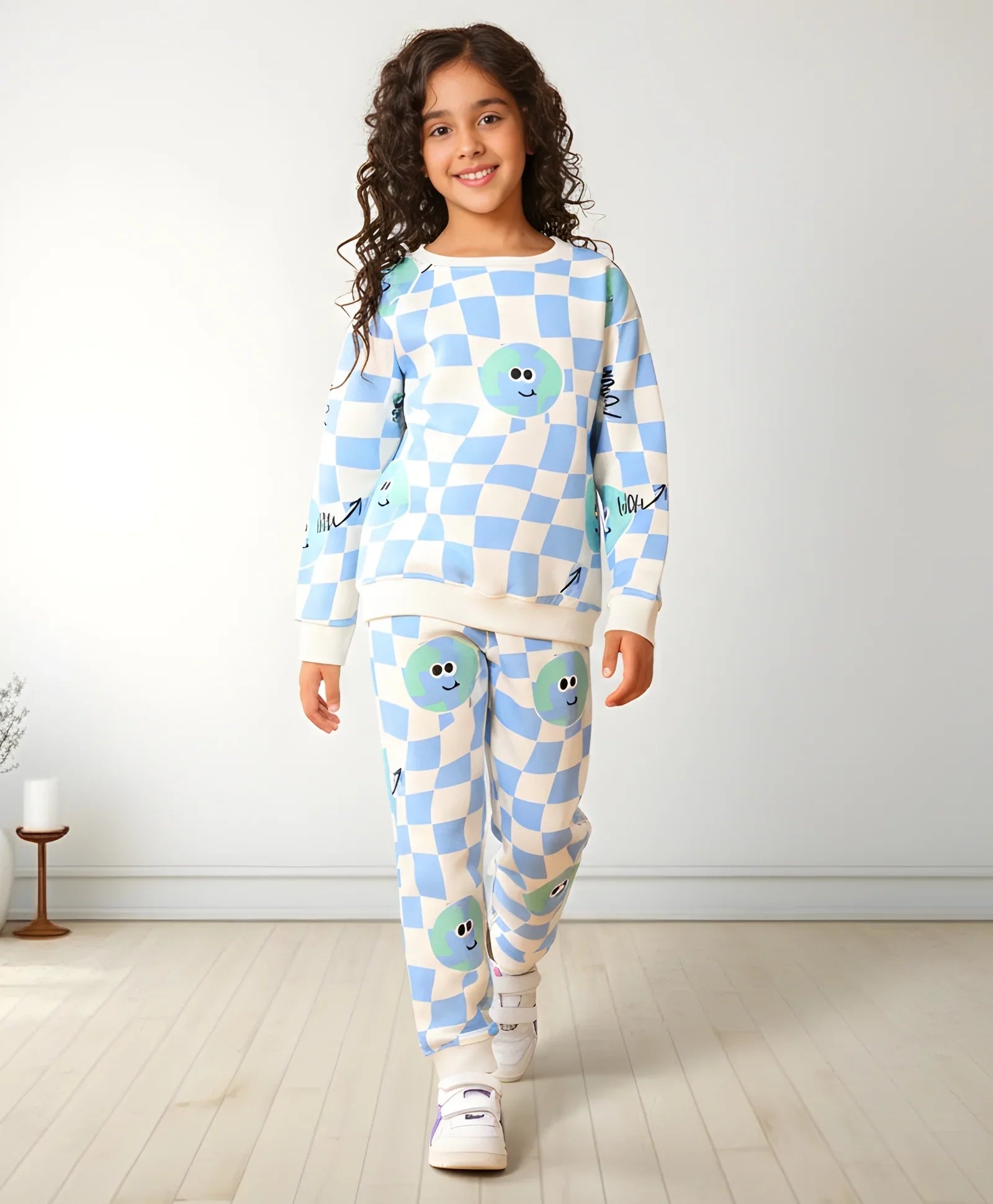 GLOBE CHECK GIRLS FLEECE SWEATSHIRT JOGGER SET - BLUE