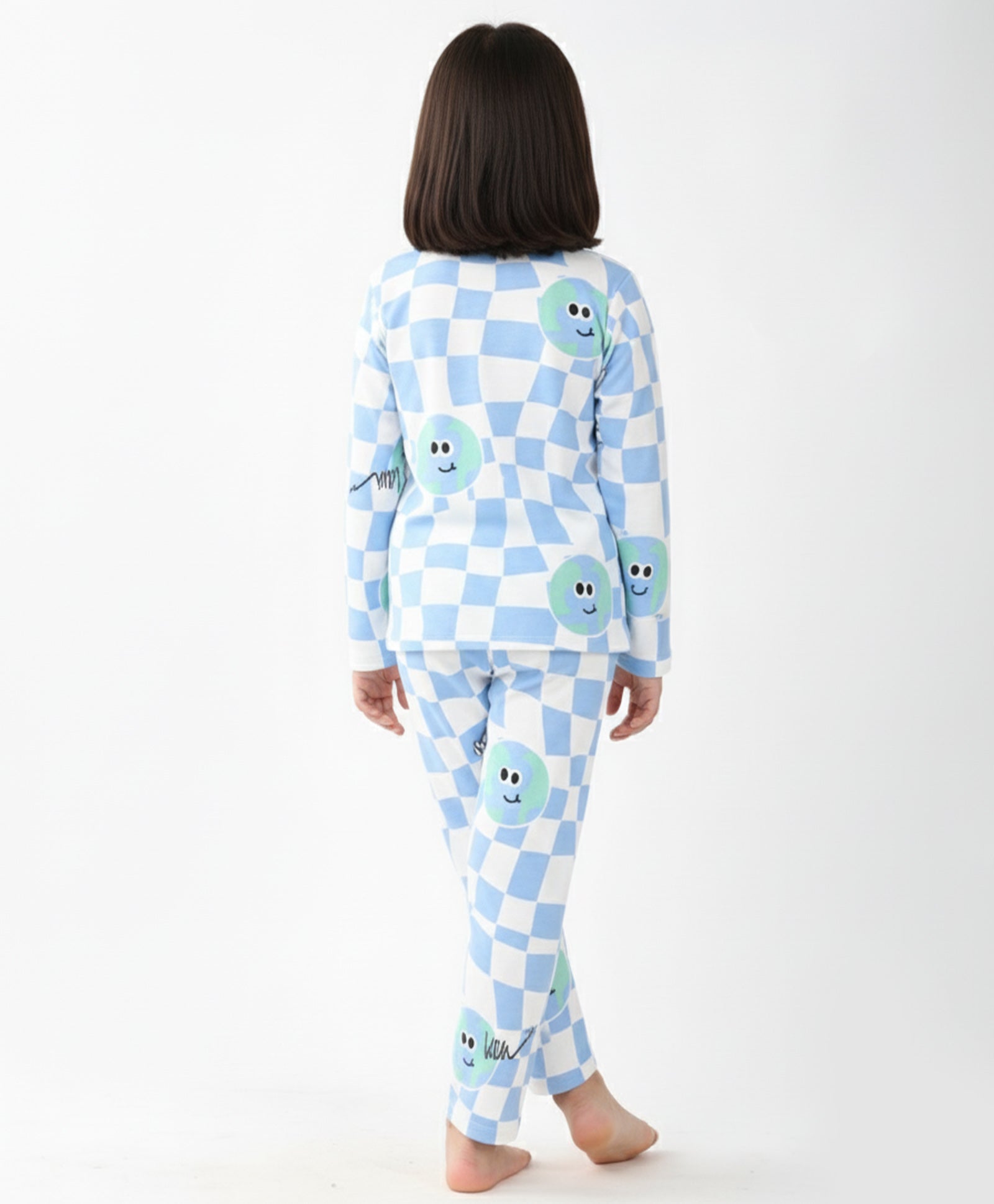 The Globe Check Girls Long Sleeves Pyjama Set in blue is crafted from pure cotton, ensuring softness, breathability, and comfort all night long. Designed with a fun globe check pattern, this set adds a playful touch to bedtime. The long sleeves provide extra warmth, making it perfect for cozy nights and relaxed evenings at home
