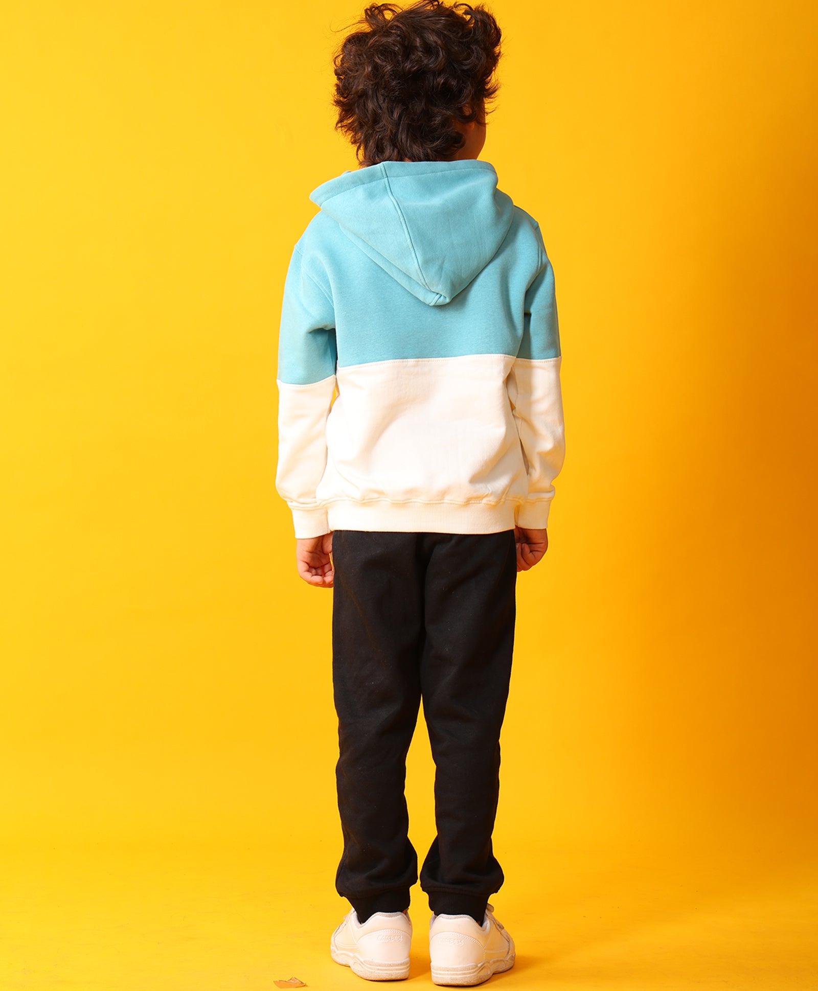 Keep your little one stylish and cozy with this Oil Green and White Color Block Hoodie with Black Joggers. Crafted from soft fleece, the hoodie features a vibrant color block design and a comfy hood, while the matching joggers offer an easy fit for playtime or outings. Perfect for casual wear, this set combines comfort, warmth, and trendy style.