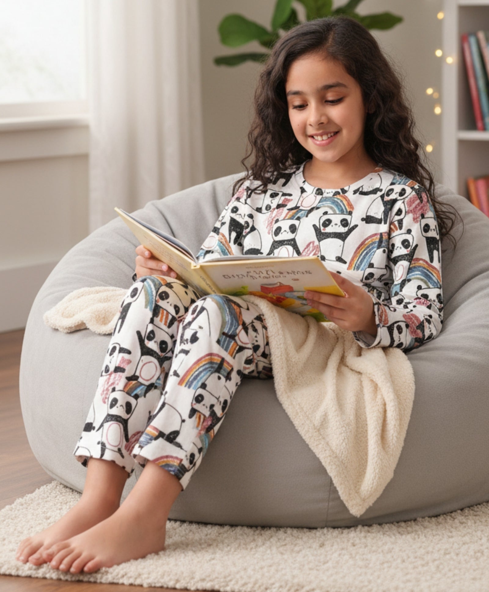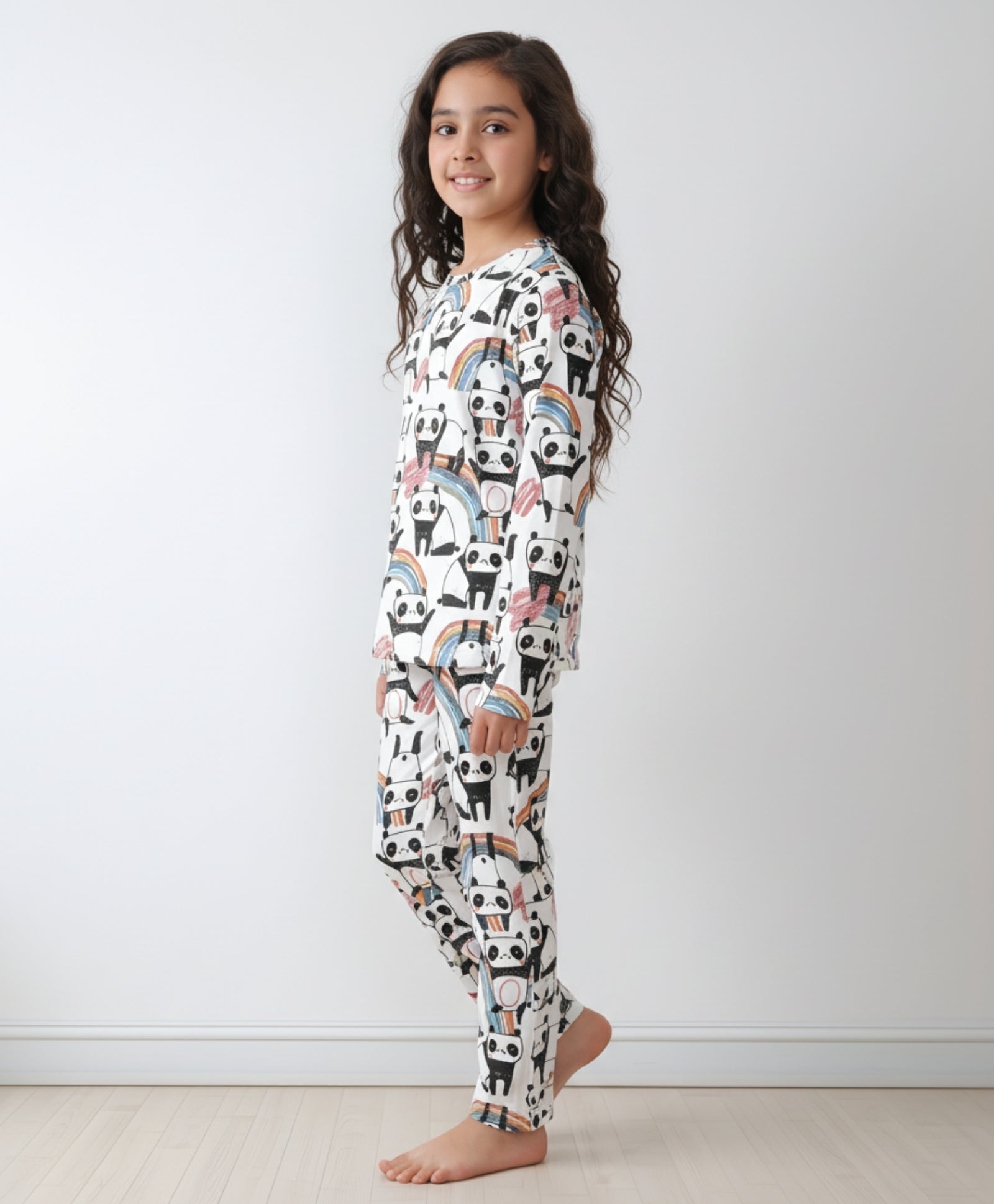 Snuggle up in style with this Panda Long Sleeves Pyjama Set for girls, made from 100% pure cotton for ultimate comfort. Featuring a cute panda face on a white top and matching pants with an elastic waistband, it's soft, breathable, and perfect for bedtime or lounging. A cozy and adorable addition to any girl's nightwear!