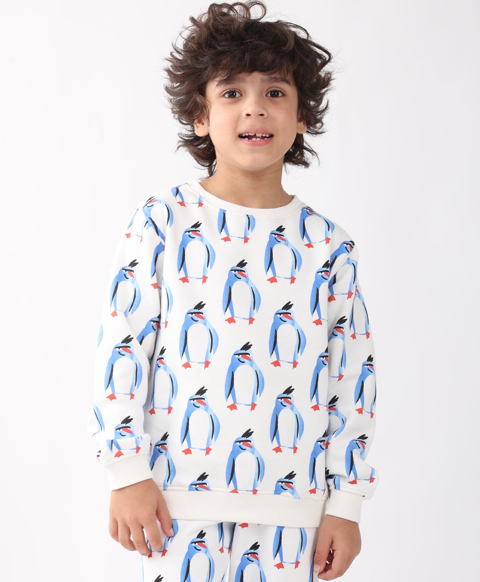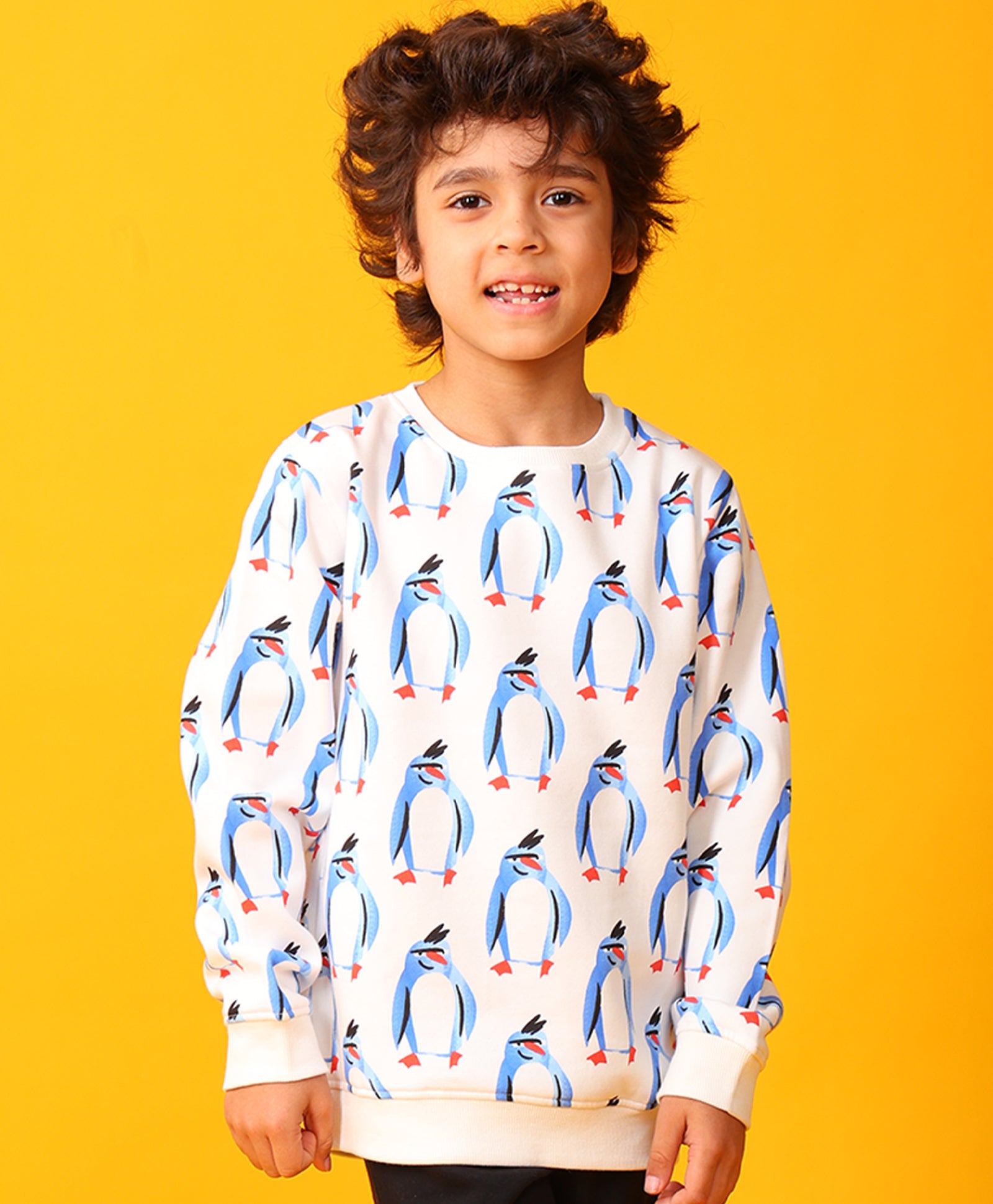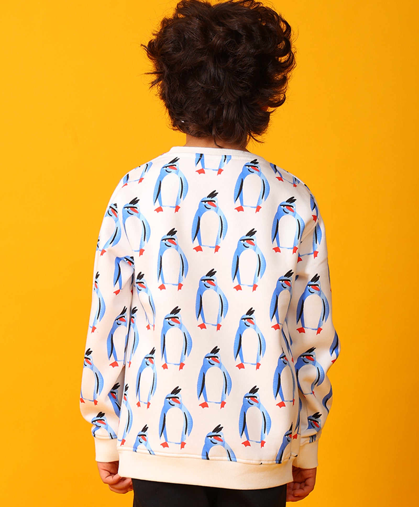 Waddle into warmth and charm with the PENGUIN FLEECE BOYS SWEATSHIRT - OFF WHITE. This incredibly soft top features a delightful, playful, ALL OVER PRINTED penguin pattern that’s simply irresistible. Crafted from cozy fleece, it provides supreme comfort and a perfect dose of adorable style for staying snug during chilly adventures.