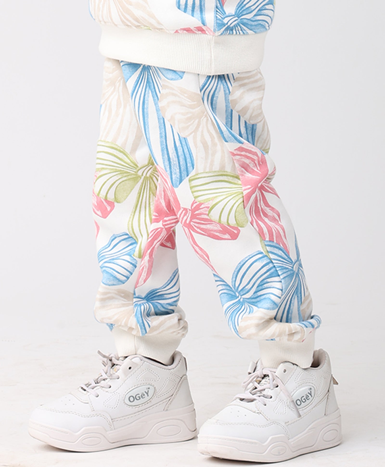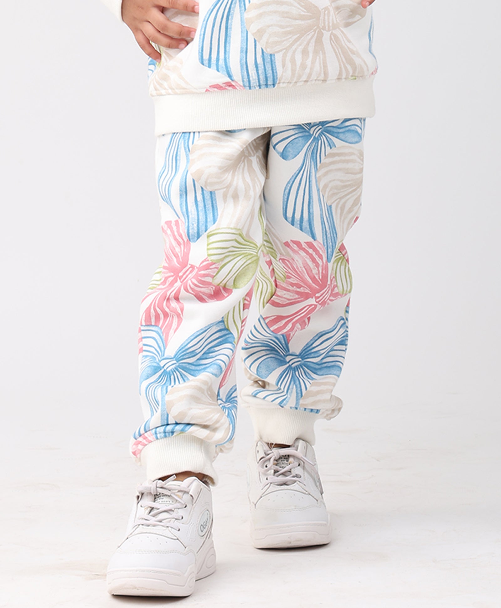 Unleash vibrant comfort with the PAINTED BOW FLEECE GIRLS JOGGER - OFF WHITE. These soft joggers feature a playful, colorful, ALL OVER PRINTED design of artistic bows. Crafted from cozy fleece, they offer the perfect blend of relaxed fit and cheerful style, making chilly days feel bright and snug for every little fashionista.