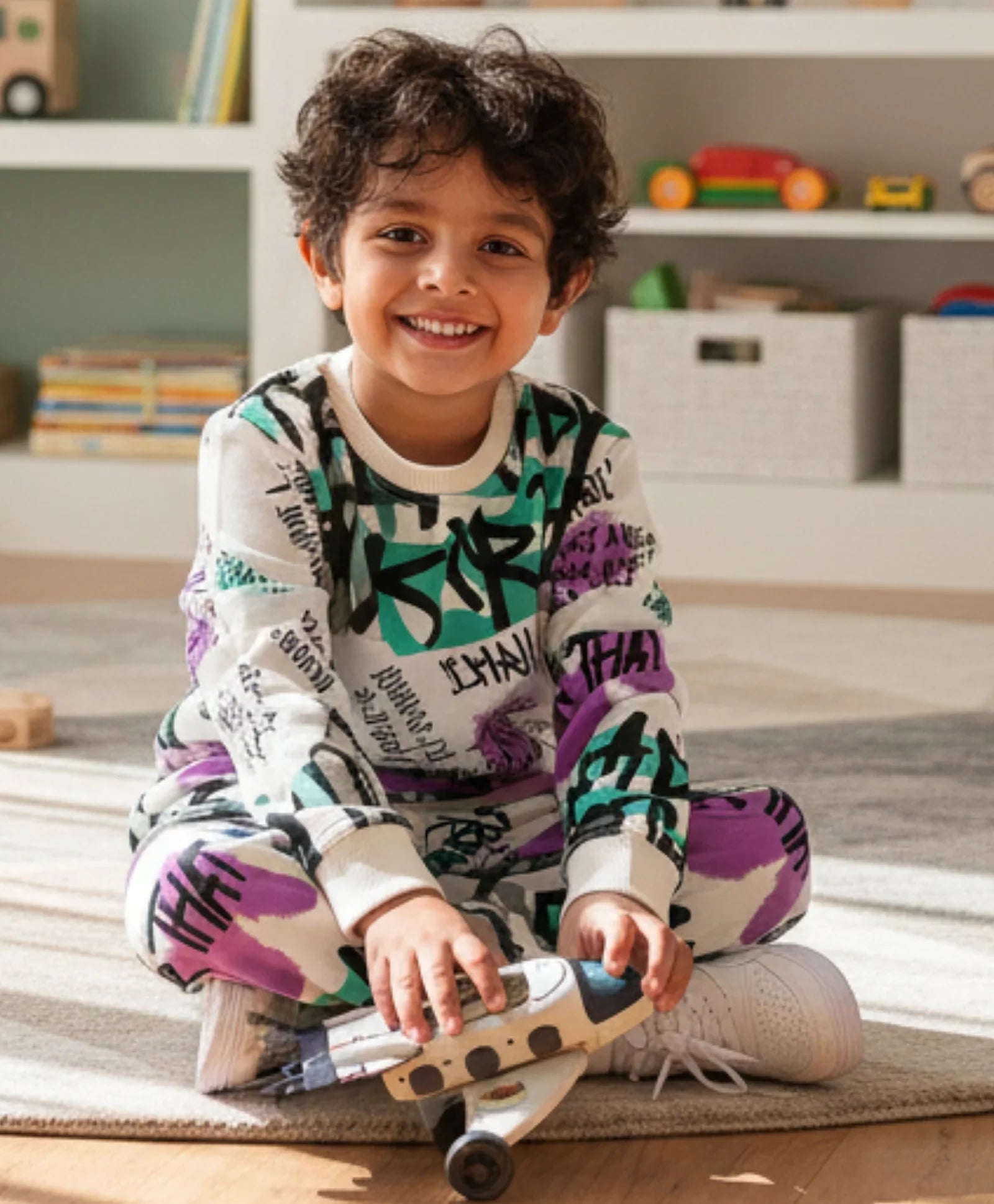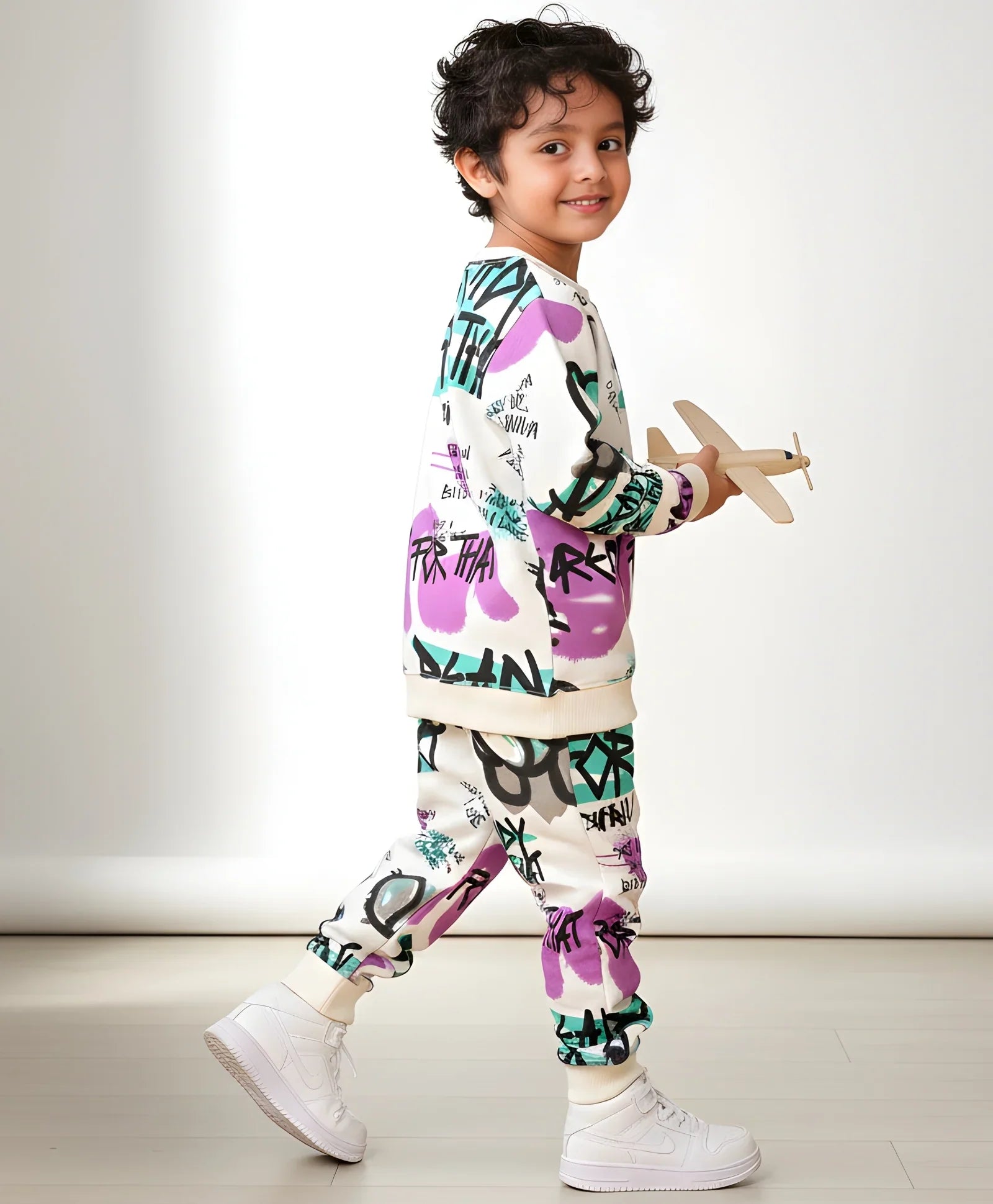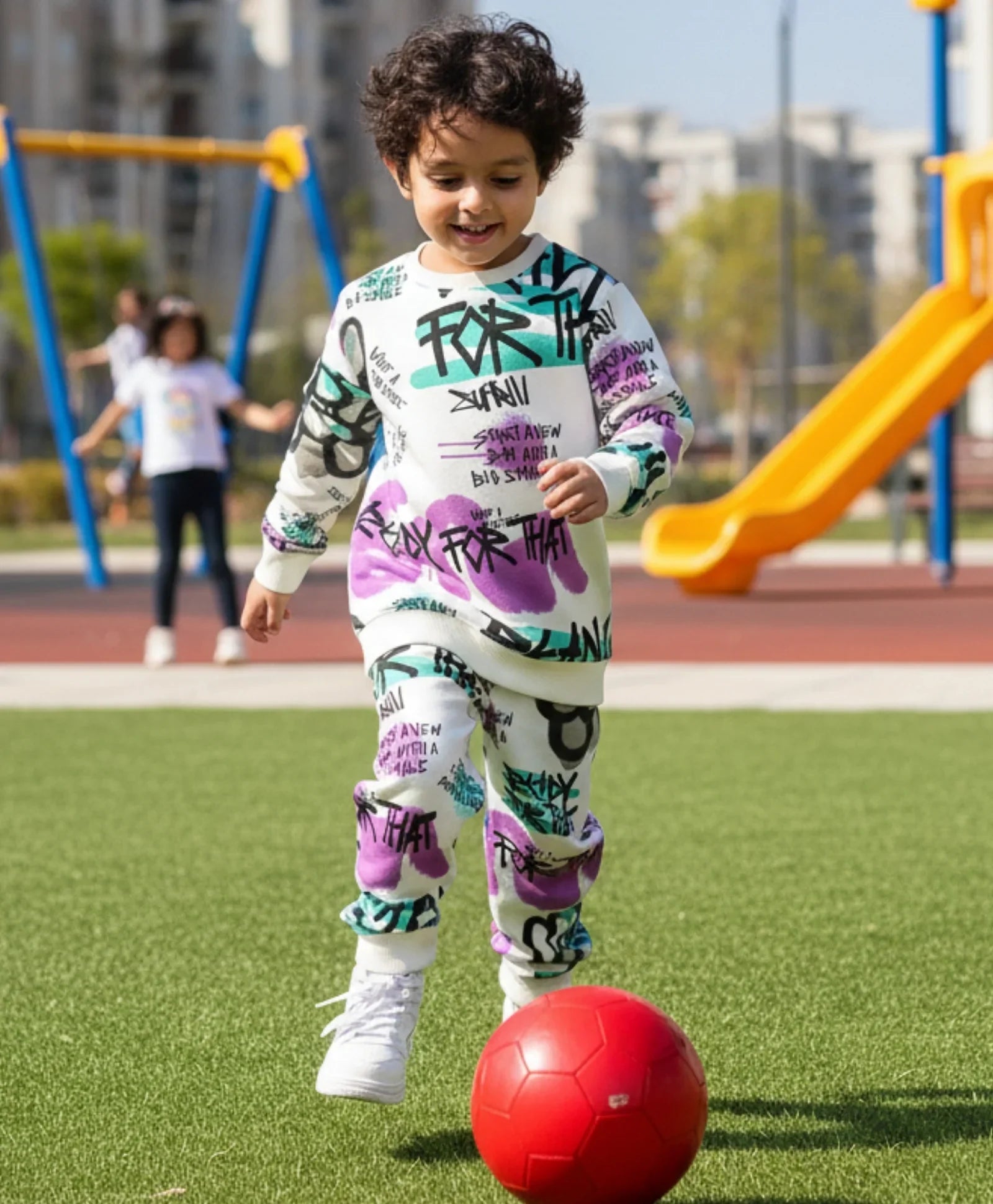 Step into comfort with this white round neck fleece sweatshirt and jogger set. Ideal for casual outings or relaxing at home, the soft fleece provides warmth and coziness. The clean, simple design makes it a versatile addition to their wardrobe, perfect for any day of the week.