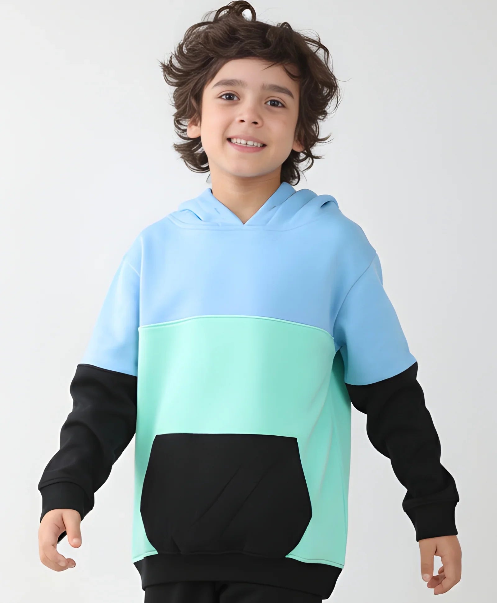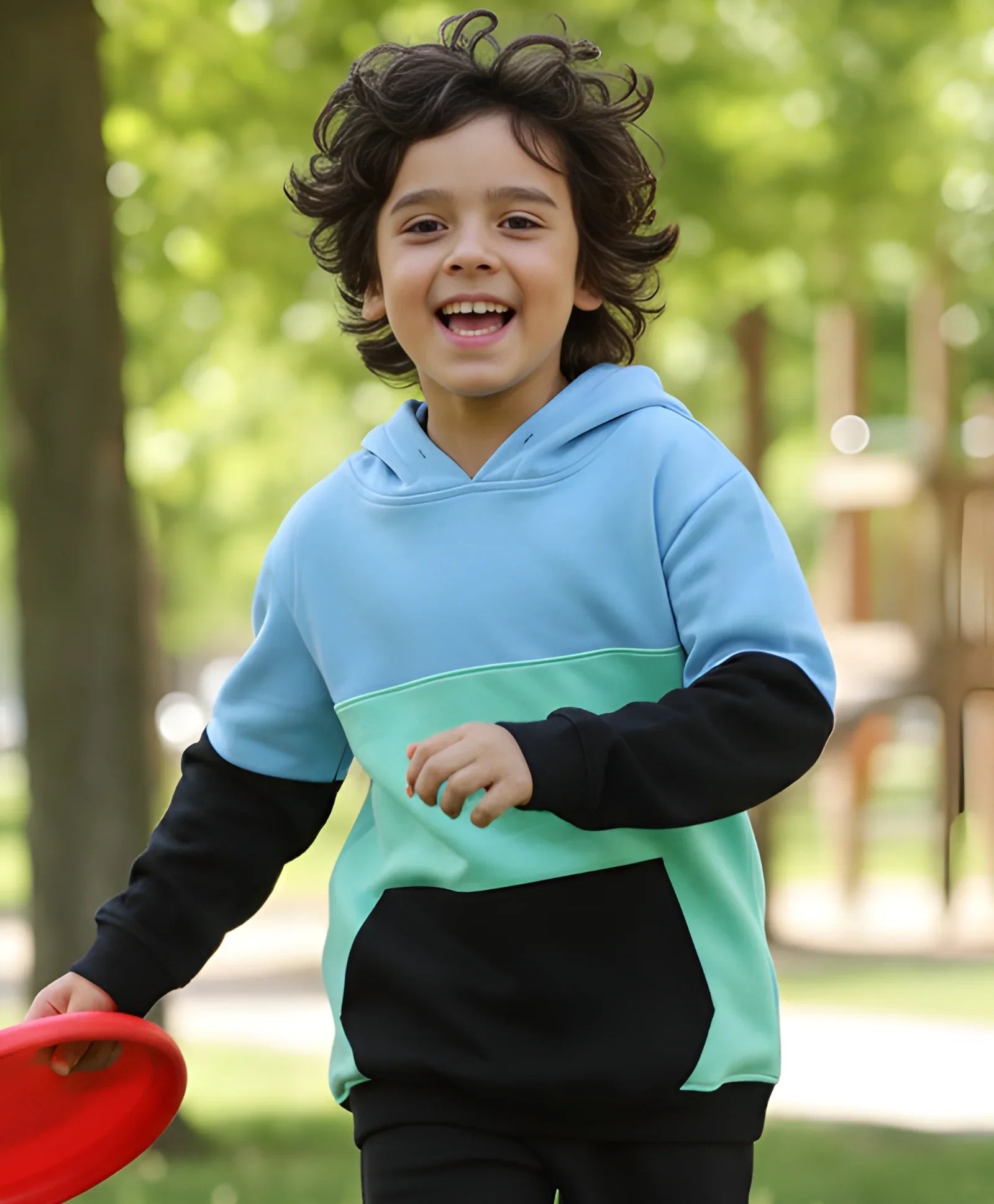 Achieve peak comfort and cool with this dynamic Seagreen Blue Black Boys Color Block Fleece Hoodie. It features a sharp, sophisticated mix of serene seagreen, deep blue, and classic black. Made with incredibly soft, thick fleece, this hoodie is the perfect gear for staying warm, whether he's hitting the playground or simply relaxing. It's an instant upgrade to his everyday casual style.