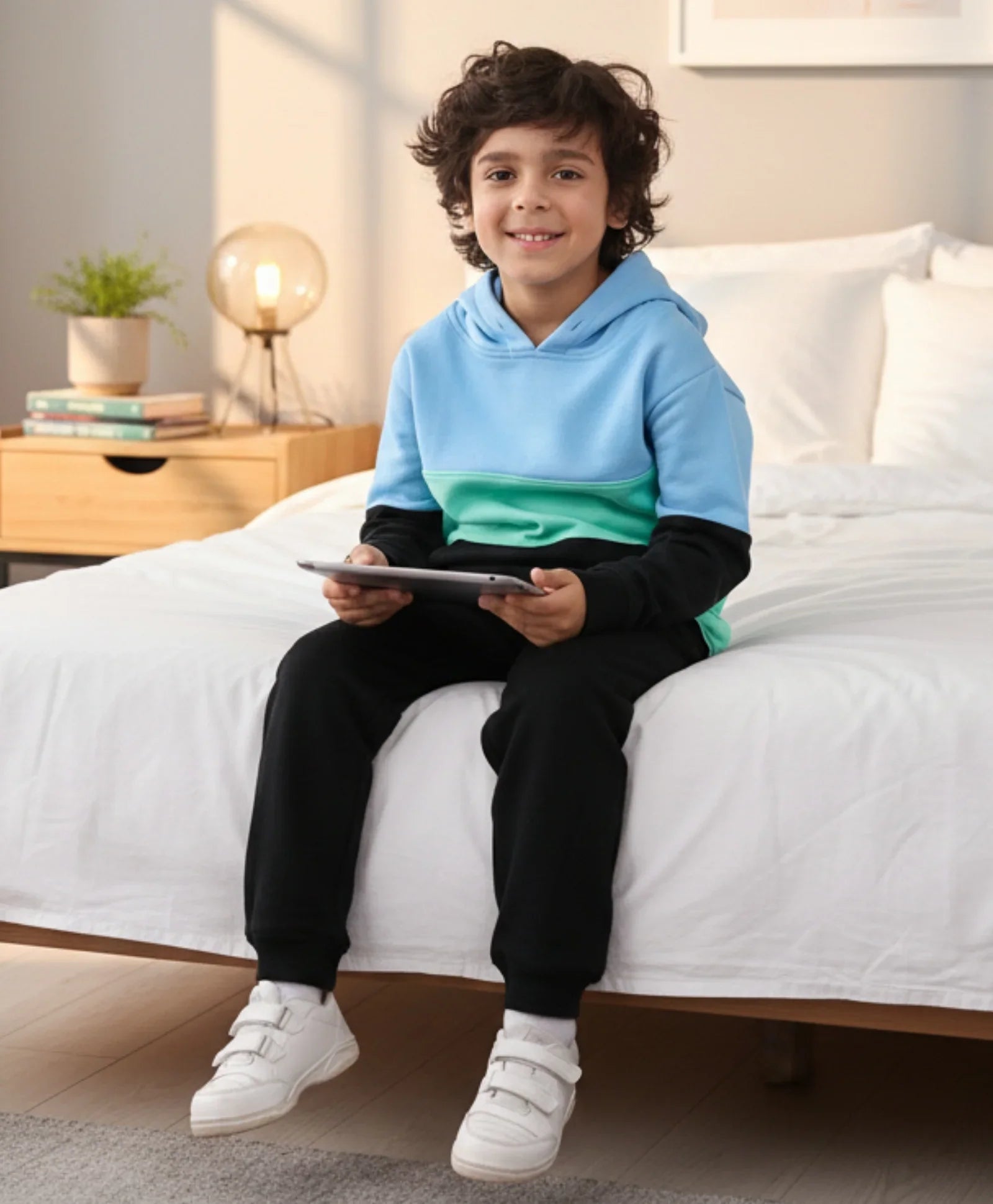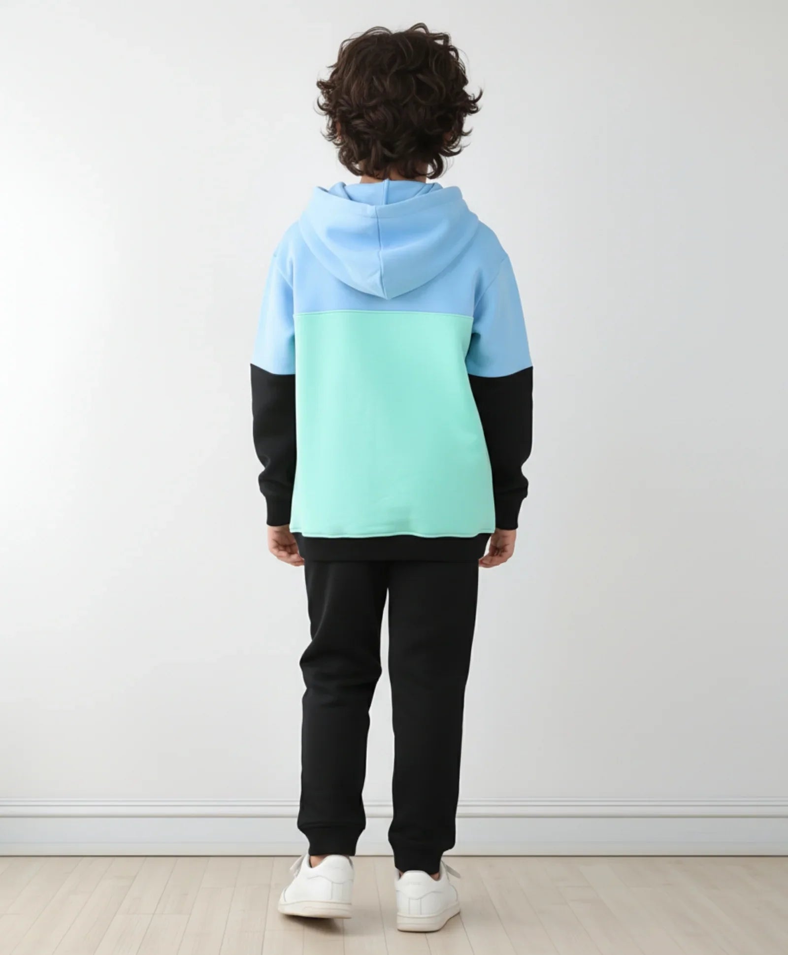Dress your little one in comfort and style with the Seagreen Blue Black Boys Hoodie & Black Jogger Set. Made from soft fleece, the vibrant seagreen and blue hoodie pairs perfectly with black joggers, offering warmth and ease of movement. Ideal for casual outings or playtime, this set keeps kids cozy while looking trendy.