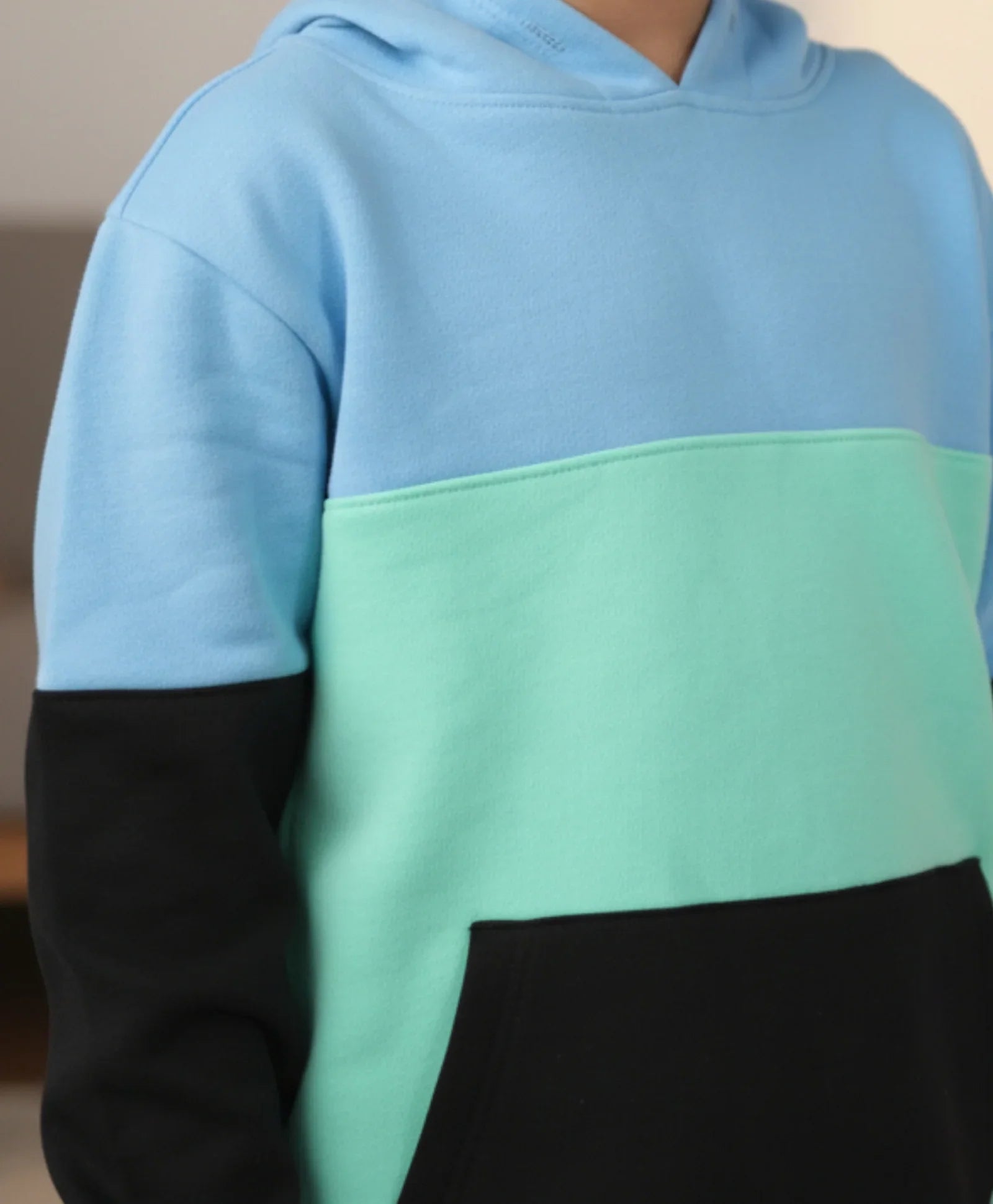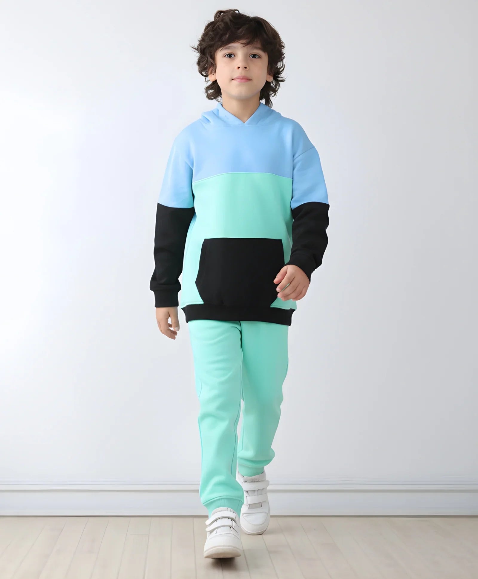 your little one in comfort and style with this Seagreen Blue Black Boys Hoodie Jogger Set. Made from soft fleece fabric, the hoodie features a cozy fit in a striking blue and sea green combination. Paired with matching joggers, this set is perfect for playtime, school, or relaxing at home, offering warmth, flexibility, and all-day comfort.