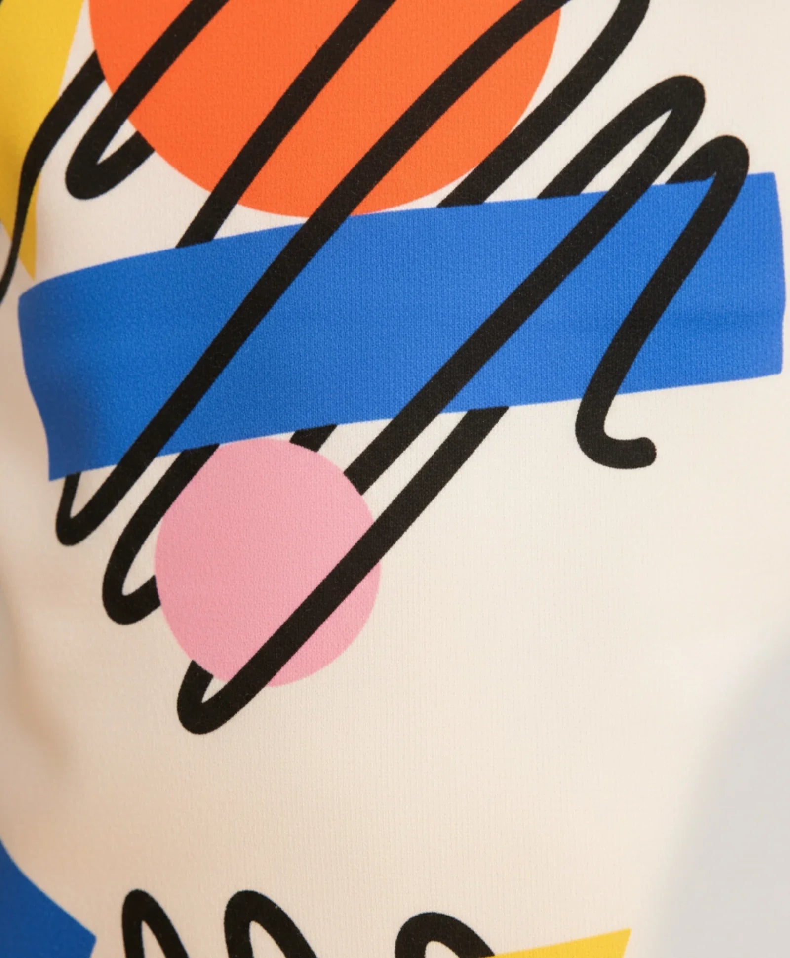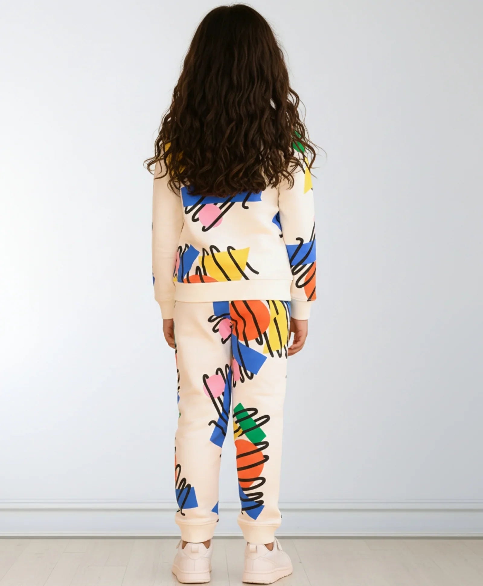 This fun white fleece sweatshirt and jogger set features colorful shapes, sparking creativity in little ones! Soft and warm, it’s perfect for playdates or relaxing at home. The comfortable fit allows for easy movement, making it a playful addition to any girl's wardrobe!