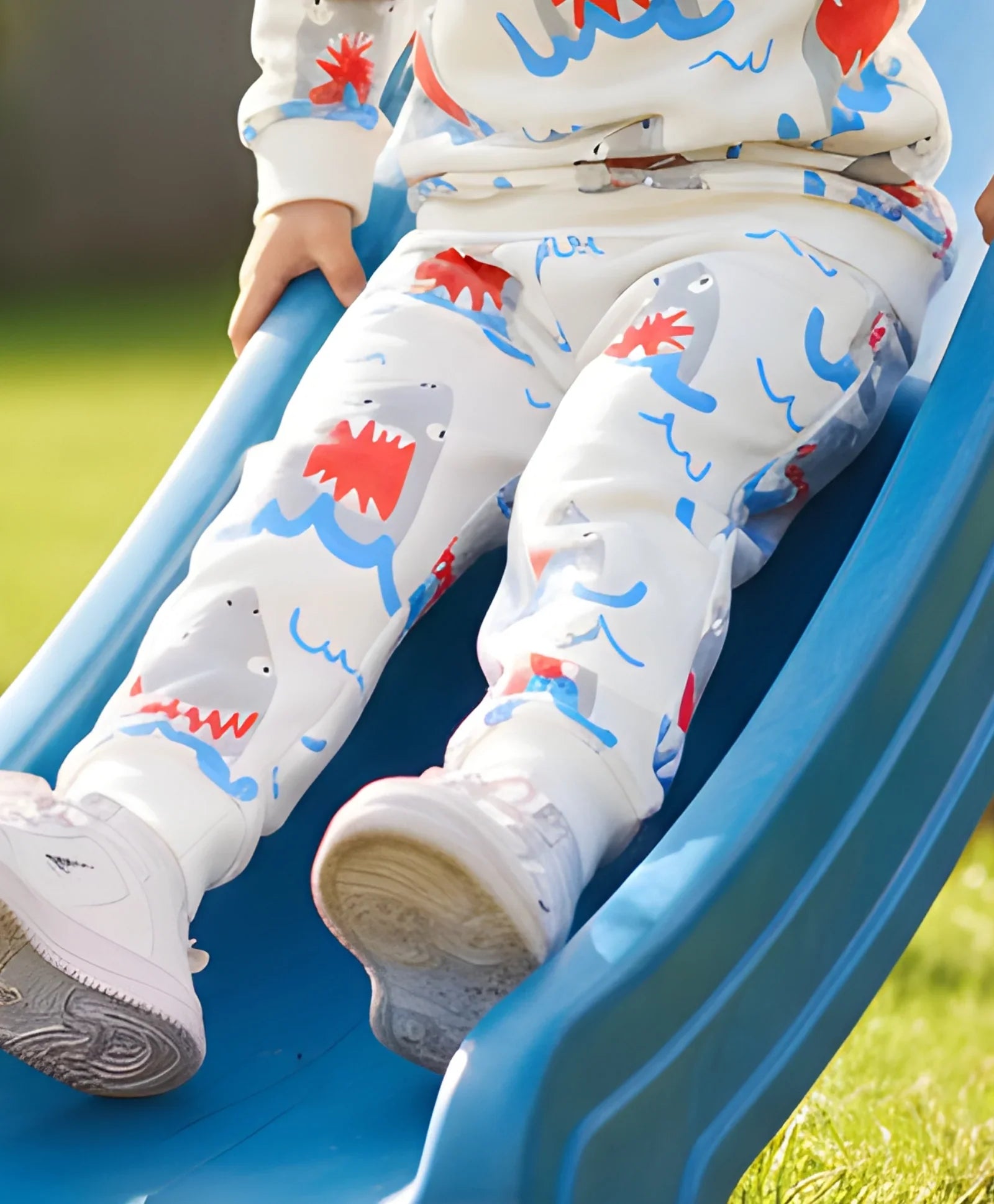Snuggle up with the ocean's coolest crew in the SLEEPY SHARK BOYS FLEECE JOGGER - OFF WHITE. These comfy bottoms feature a fun, ALL OVER PRINTED pattern of snoozing sharks on a soft white base. Made from warm FLEECE, they guarantee cozy warmth for deep, deep-sea dreams.
