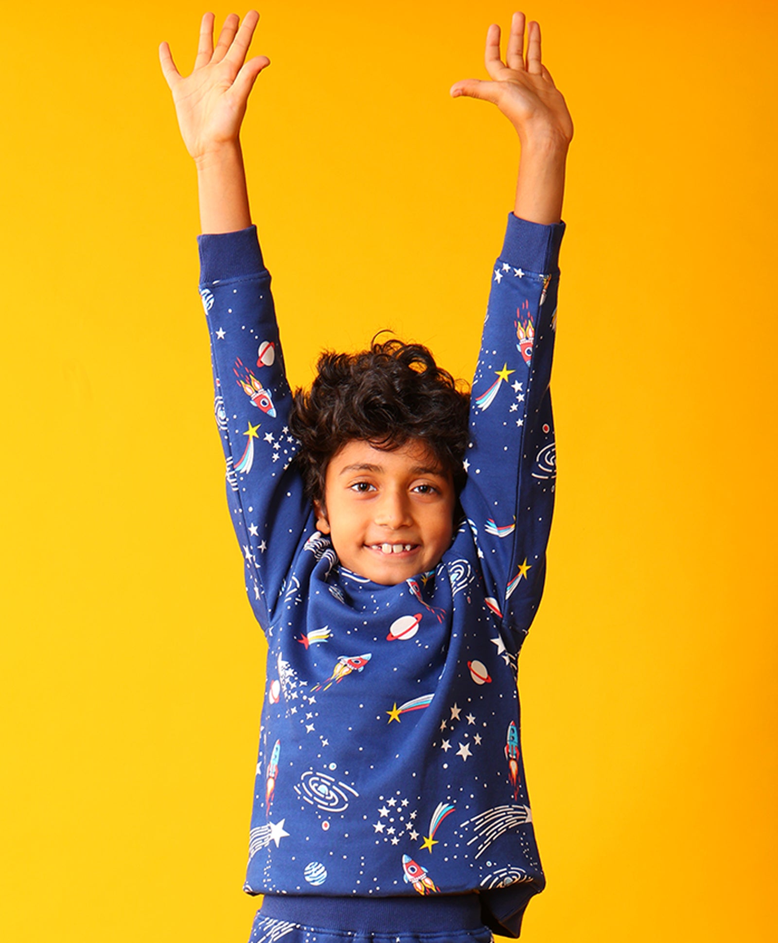 Explore cosmic comfort with the SOLAR DREAMS BOYS FLEECE SWEATSHIRT - BLUE. This stellar top features a fascinating, vibrant, ALL OVER PRINTED design of planets and stars that sparks imagination. Crafted from super-soft fleece, it’s the perfect warm, cozy layer for budding astronomers and young adventurers dreaming of the final frontier.