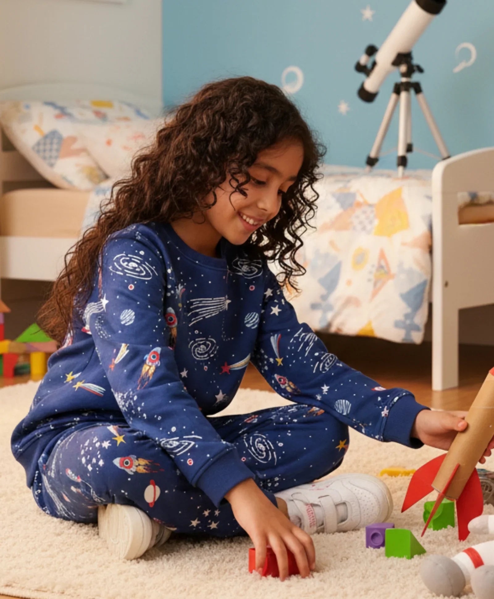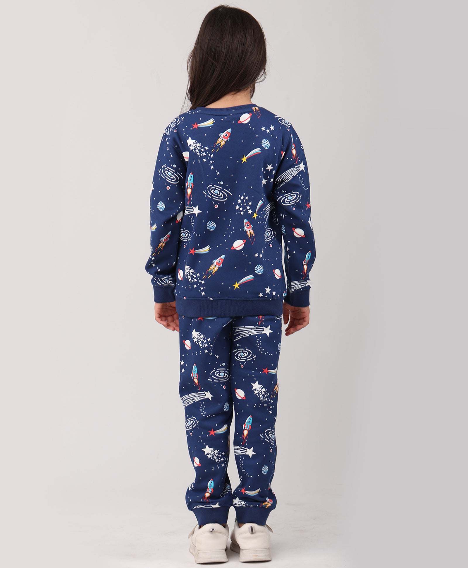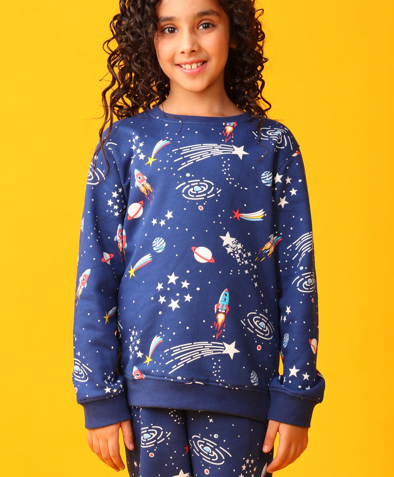 The Solar Dreams Girls Fleece Sweatshirt Jogger Set – Blue is made from soft fleece fabric for warmth and comfort. Featuring a solar-inspired design, the sweatshirt pairs perfectly with matching joggers for a stylish, coordinated look. Perfect for school, play, or lounging, this versatile set keeps kids cozy while adding a fun and trendy touch to their everyday wardrobe.