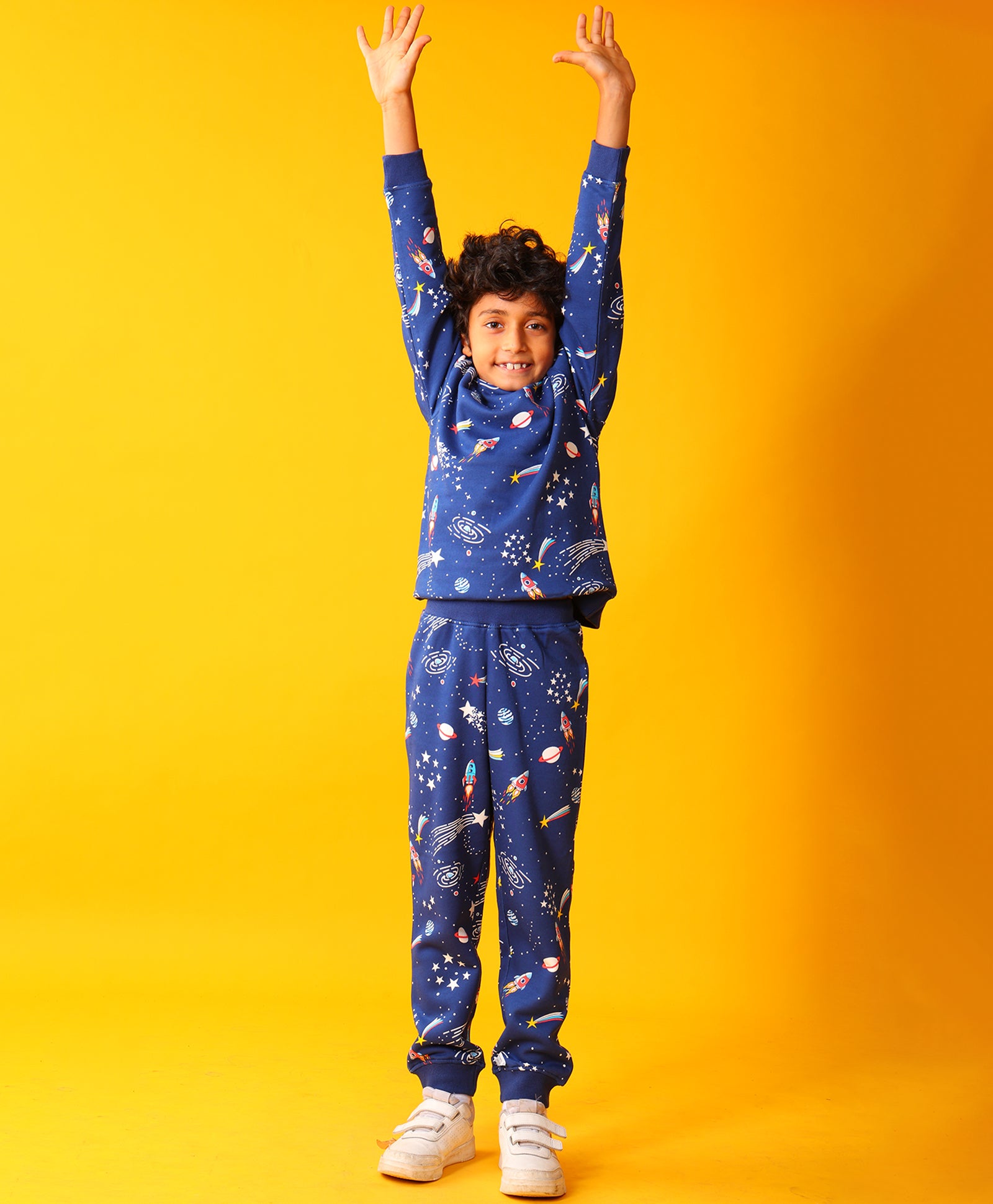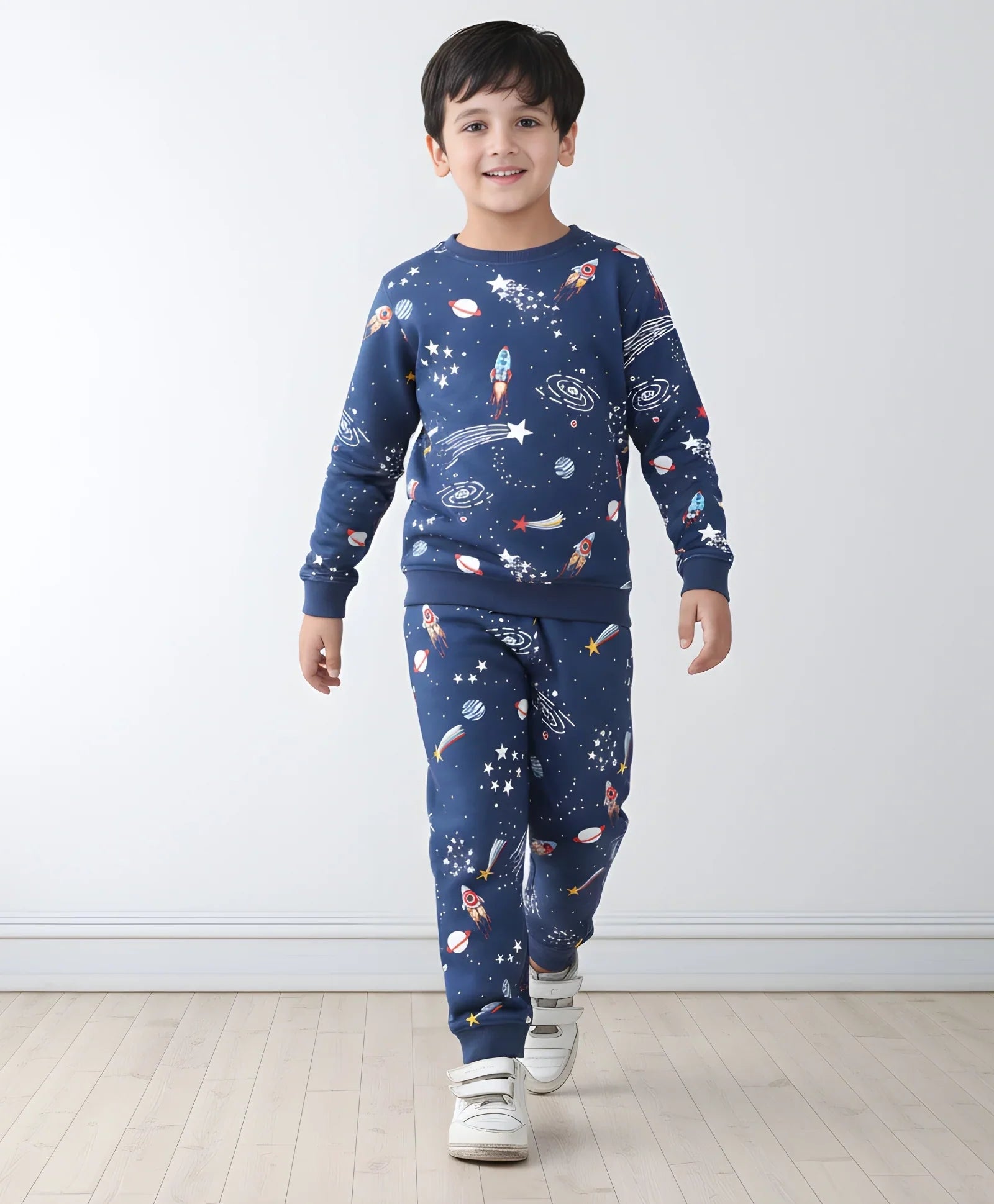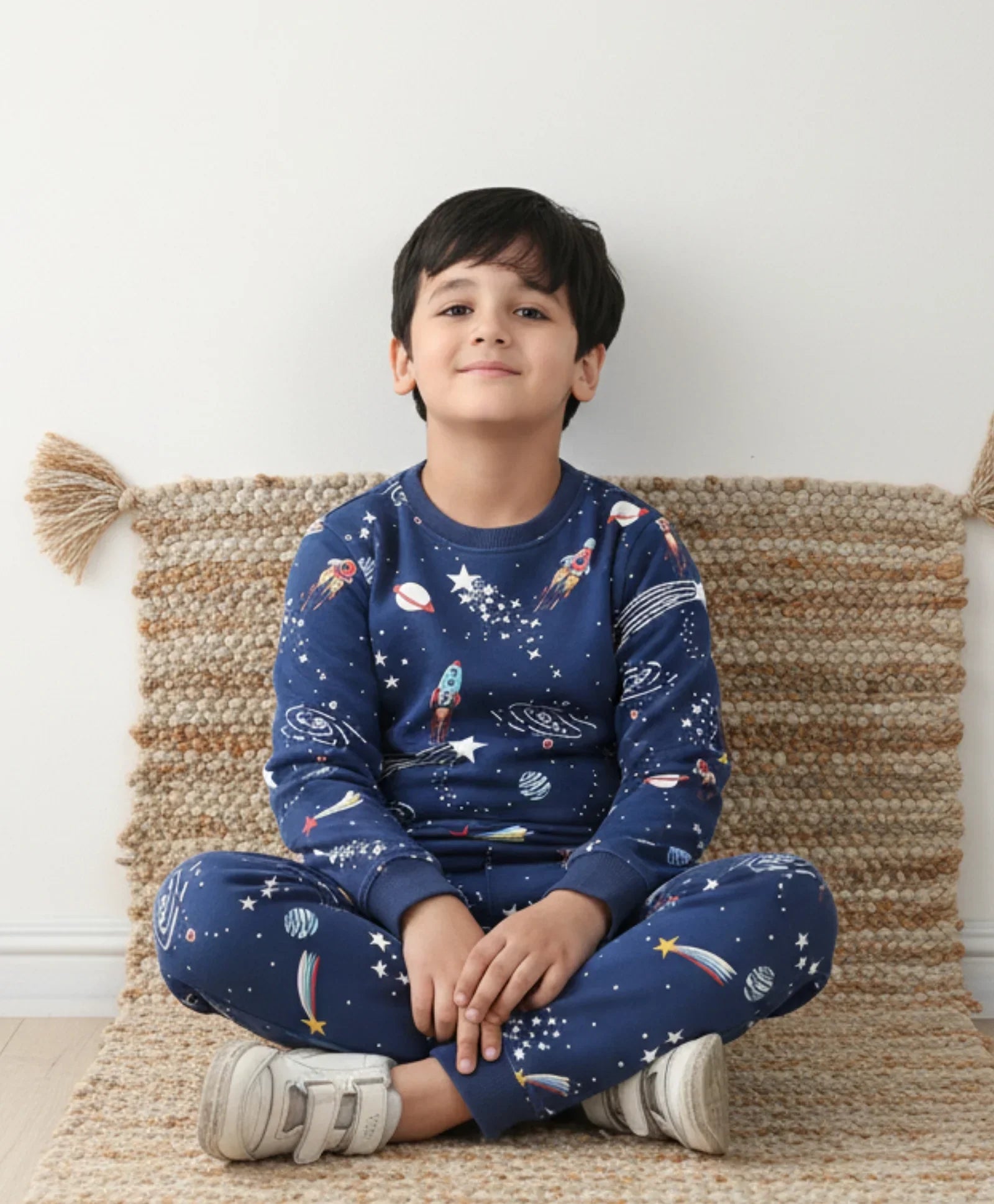 The Solar Dreams Fleece Sweatshirt Jogger Set in navy is perfect for keeping kids warm and stylish. Made from soft fleece, it features a cozy sweatshirt and matching joggers, ideal for playtime, outings, or lounging. With its fun, dreamy design and comfortable fit, this set ensures all-day comfort and a trendy look for little ones.