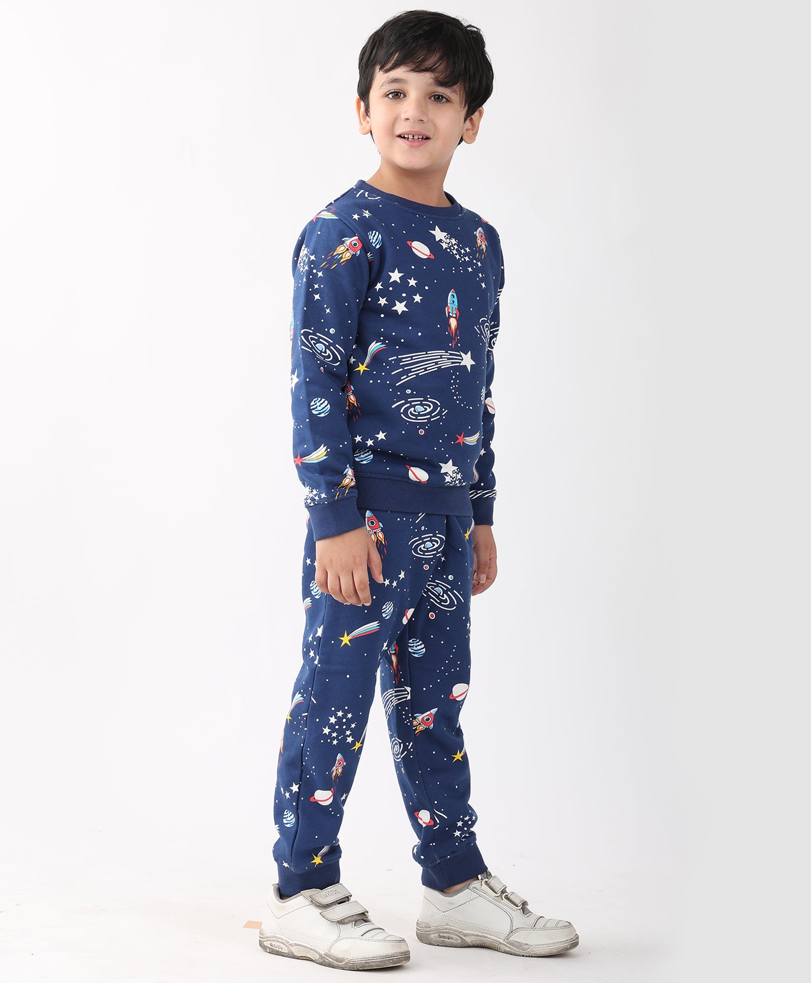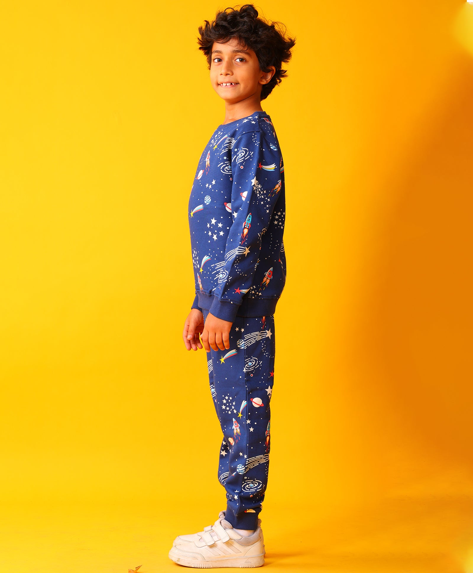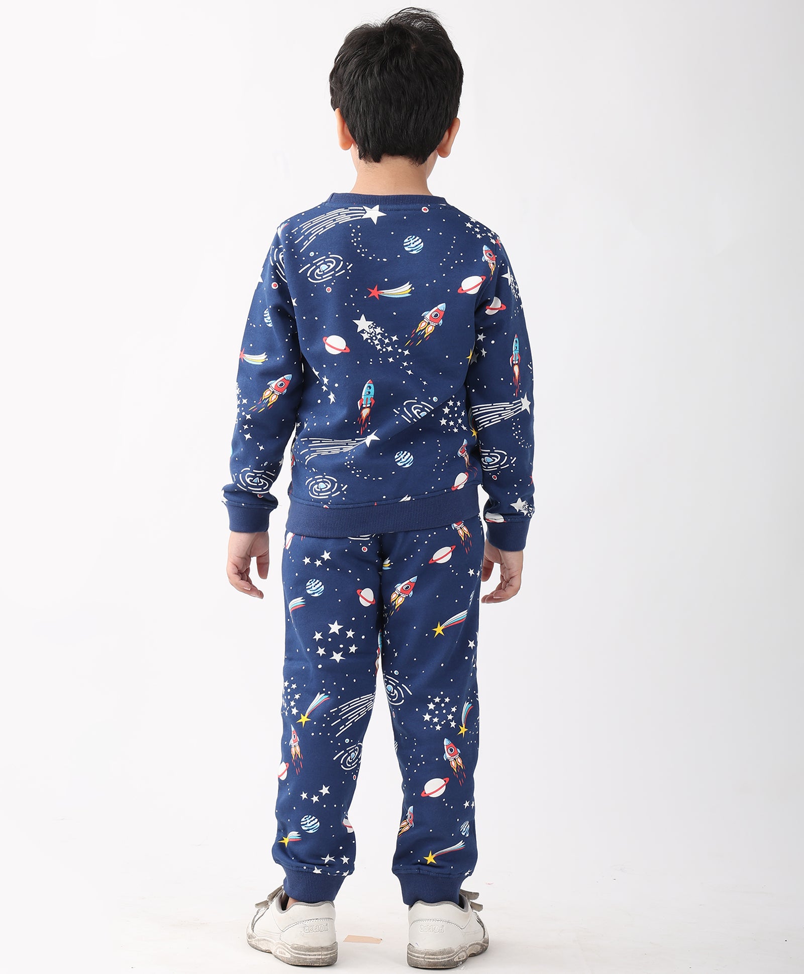 The Solar Dreams Fleece Sweatshirt Jogger Set in navy is perfect for keeping kids warm and stylish. Made from soft fleece, it features a cozy sweatshirt and matching joggers, ideal for playtime, outings, or lounging. With its fun, dreamy design and comfortable fit, this set ensures all-day comfort and a trendy look for little ones.