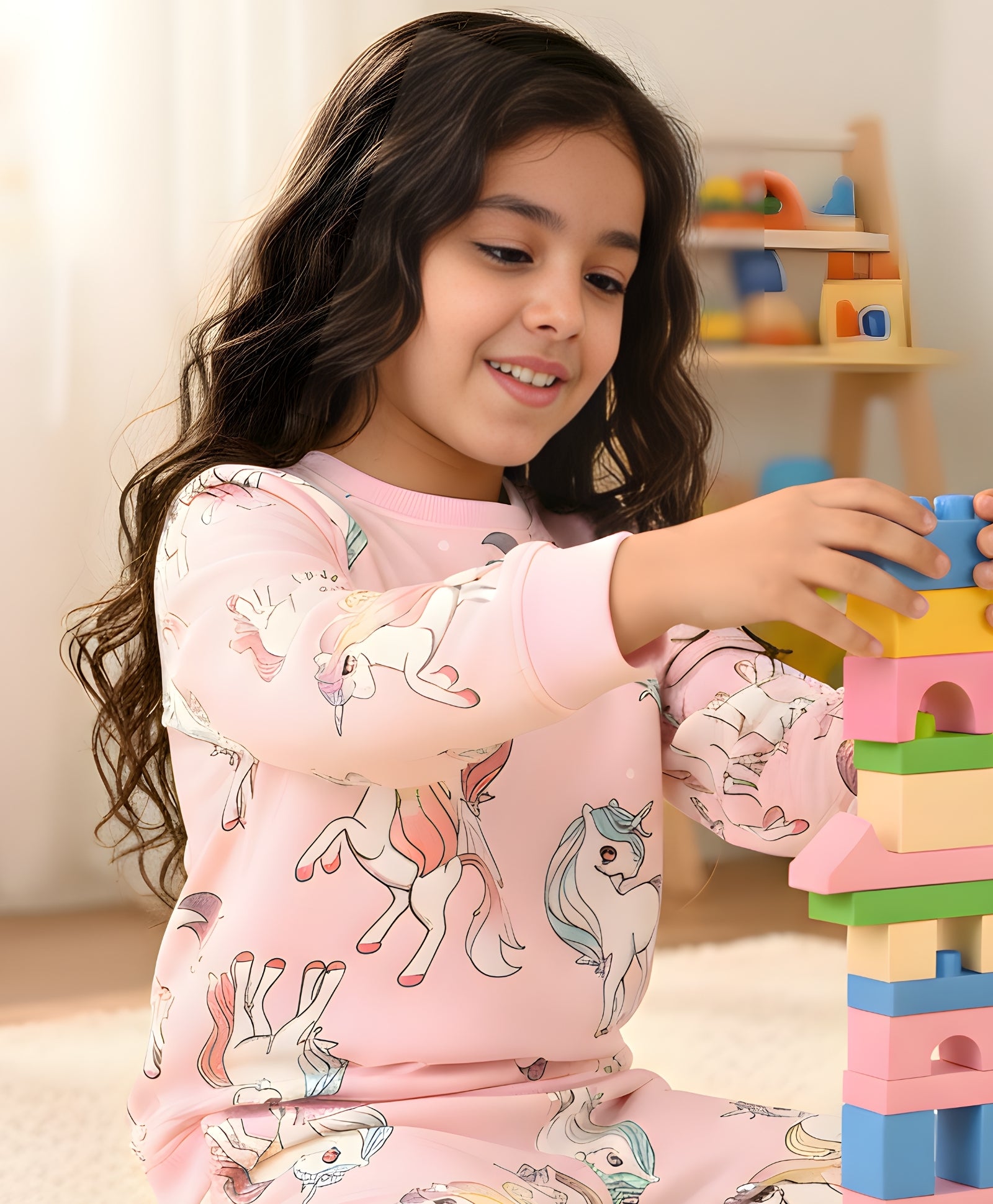 Add a touch of magic with this pretty pink unicorn star fleece sweatshirt. The delightful design and soft fleece provide cozy warmth and style. Perfect for playful days or lounging at home, this sweatshirt ensures she stays warm while showcasing her love for unicorns.